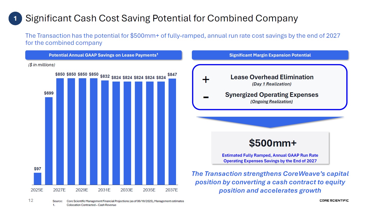 $500mm+  Estimated Fully Ramped, Annual GAAP Run Rate Operating Expenses Savings by the End of 2027  +  Lease Overhead Elimination  (Day 1 Realization)  - Synergizedngoing(O OperRealization)a ting Expenses  Significant Cash Cost Saving Potential for Combined Company  The Transaction has the potential for $500mm+ of fully-ramped, annual run rate cost savings by the end of 2027 for the combined company  Potential Annual GAAP Savings on Lease Payments1 Significant Margin Expansion Potential  ($ in millions)  $97  $699  $850 $850 $850 $850 $832 $824 $824 $824 $824 $824 $847  2025E  2027E 2029E 2031E 2033E 2035E 2037E  Source: Core Scientific Management Financial Projections (as of 06/18/2025), Management estimates  12  The Transaction strengthens CoreWeave’s capital position by converting a cash contract to equity position and accelerates growth  1  1.  Colocation Contracted – Cash Revenue