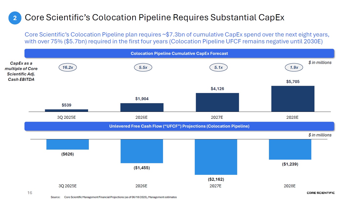 Core Scientific’s Colocation Pipeline Requires Substantial CapEx  Core Scientific’s Colocation Pipeline plan requires ~$7.3bn of cumulative CapEx spend over the next eight years,  with over 75% ($5.7bn) required in the first four years (Colocation Pipeline UFCF remains negative until 2030E)  Colocation Pipeline Cumulative CapEx Forecast  $539  $1,904  $4,126  $5,705  3Q 2025E  2026E 2027E  Unlevered Free Cash Flow (“UFCF”) Projections (Colocation Pipeline)  2028E  ($626)  ($1,455)  ($1,239)  ($2,162)  2027E  3Q 2025E  2026E  2028E  16.2x  CapEx as a multiple of Core Scientific Adj. Cash EBITDA  5.5x  5.1x  1.9x  $ in millions  $ in millions  2  16  Source: Core Scientific Management Financial Projections (as of 06/18/2025), Management estimates