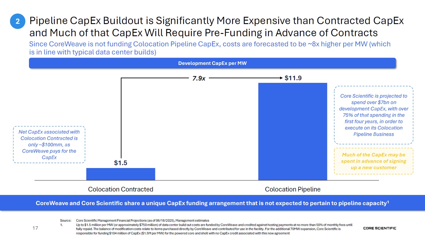 $1.5  $11.9  17  Pipeline CapEx Buildout is Significantly More Expensive than Contracted CapEx and Much of that CapEx Will Require Pre-Funding in Advance of Contracts  7.9x  Source: Core Scientific Management Financial Projections (as of 06/18/2025), Management estimates  1.  Up to $1.5 million per MW (or approximately $750 million) of data center build out costs are funded by CoreWeave and credited against hosting payments at no more than 50% of monthly fees until fully repaid. The balance of modification costs relate to items purchased directly by CoreWeave and contributed for use in the facility. For the additional 70MW expansion, Core Scientific is responsible for funding $104 million of CapEx ($1.5M per MW) for the powered core and shell with no CapEx credit associated with this new agreement  Since CoreWeave is not funding Colocation Pipeline CapEx, costs are forecasted to be ~8x higher per MW (which  is in line with typical data center builds)  Development CapEx per MW  Core Scientific is projected to spend over $7bn on development CapEx, with over 75% of that spending in the first four years, in order to execute on its Colocation Pipeline Business  Net CapEx associated with Colocation Contracted is only ~$100mm, as CoreWeave pays for the CapEx  Colocation Contracted Colocation Pipeline  CoreWeave and Core Scientific share a unique CapEx funding arrangement that is not expected to pertain to pipeline capacity1  2  Much of the CapEx may be spent in advance of signing up a new customer