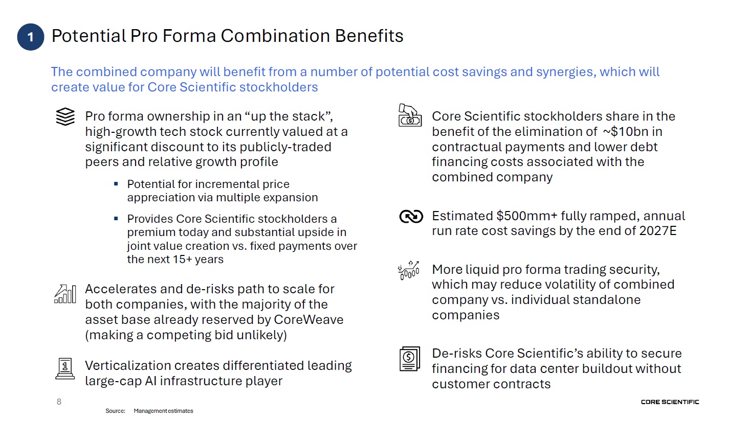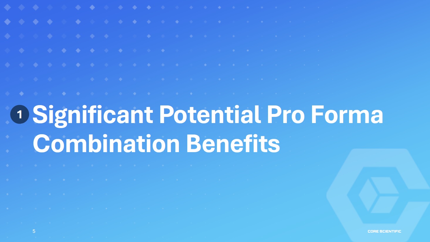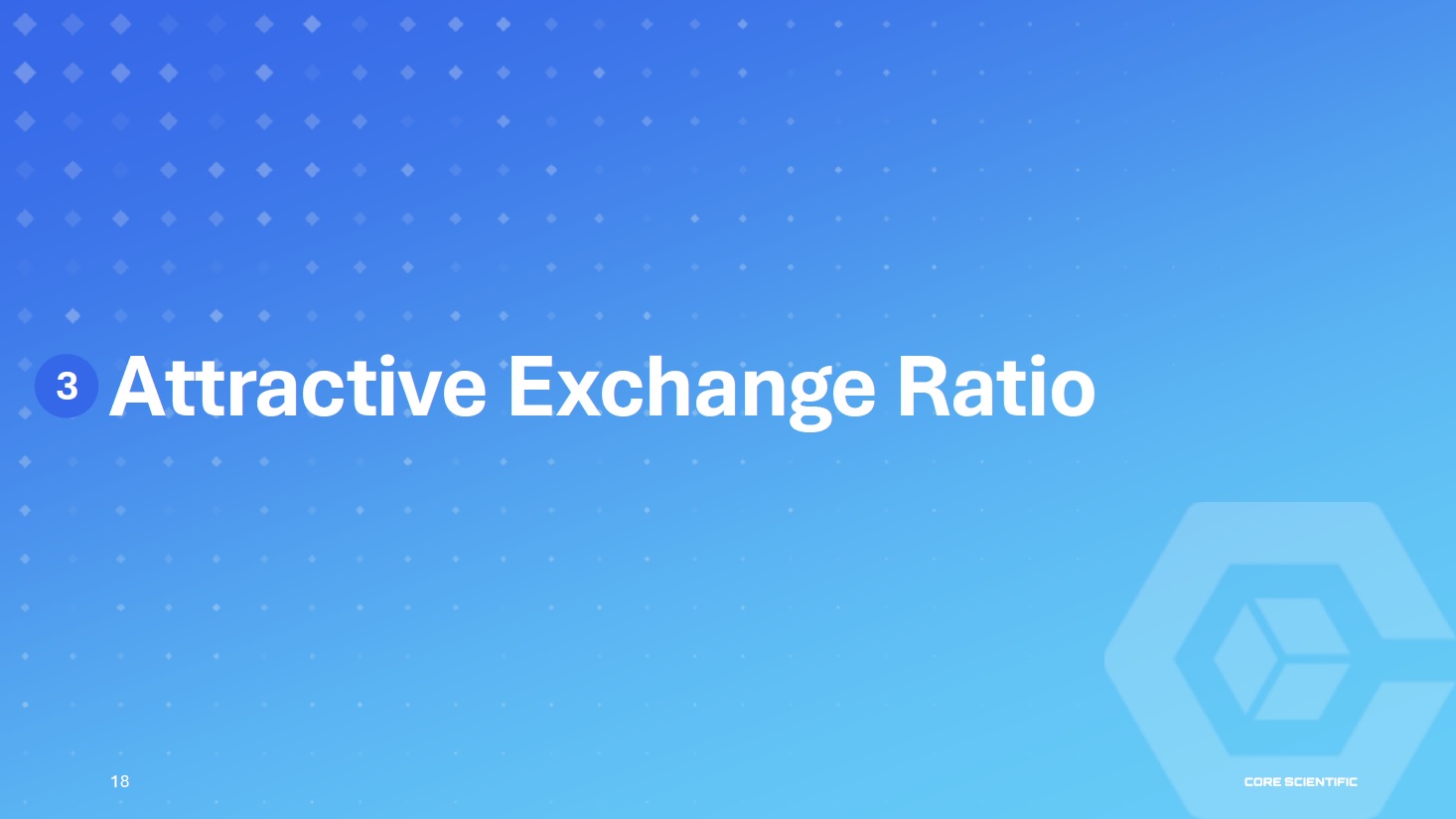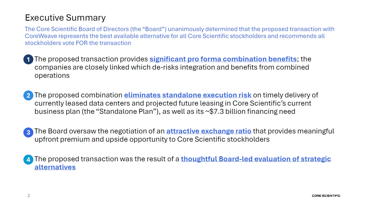 Executive Summary  2  The Core Scientific Board of Directors (the “Board”) unanimously determined that the proposed transaction with CoreWeave represents the best available alternative for all Core Scientific stockholders and recommends all stockholders vote FOR the transaction  1 The proposed transaction provides significant pro forma combination benefits; the companies are closely linked which de-risks integration and benefits from combined operations  2 The proposed combination eliminates standalone execution risk on timely delivery of  currently leased data centers and projected future leasing in Core Scientific’s current business plan (the “Standalone Plan”), as well as its ~$7.3 billion financing need  3 The Board oversaw the negotiation of an attractive exchange ratio that provides meaningful upfront premium and upside opportunity to Core Scientific stockholders  4 The proposed transaction was the result of a thoughtful Board-led evaluation of strategic  alternatives