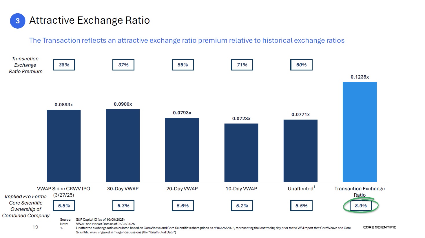 0.0893x  0.0900x  0.0793x  0.0723x  0.0771x  0.1235x  VWAP Since CRWV IPO  (3/27/25)  30-Day VWAP  20-Day VWAP  10-Day VWAP  Unaffected1  Attractive Exchange Ratio  The Transaction reflects an attractive exchange ratio premium relative to historical exchange ratios  3  60%  71%  56%  37%  38%  5.5%  5.2%  5.6%  6.3%  5.5%  Transaction Exchange Ratio  8.9%  Implied Pro Forma Core Scientific Ownership of Combined Company  19  Source: S&P Capital IQ (as of 10/09/2025)  Note: VWAP and Market Data as of 06/25/2025  1.  Unaffected exchange ratio calculated based on CoreWeave and Core Scientific’s share prices as of 06/25/2025, representing the last trading day prior to the WSJ report that CoreWeave and Core  Scientific were engaged in merger discussions (the “Unaffected Date”)  Transaction Exchange Ratio Premium