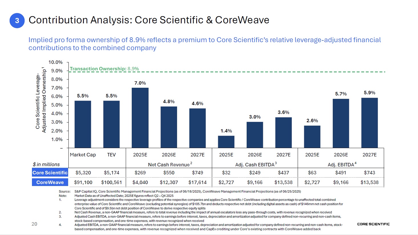 5.5%  5.5%  7.0%  4.8%  4.6%  1.4%  3.0%  3.6%  2.6%  5.7%  5.9%  9.0%  8.0%  7.0%  6.0%  5.0%  4.0%  3.0%  2.0%  1.0%  Implied pro forma ownership of 8.9% reflects a premium to Core Scientific’s relative leverage-adjusted financial contributions to the combined company  10.0%  Core Scientific Leverage- Adjusted Implied Ownership1  20  Contribution Analysis: Core Scientific & CoreWeave   Transaction Ownership: 8.9%   Market Cap TEV  2025E 2026E 2027E  Net Cash Revenue 2  2025E 2026E 2027E  Adj. Cash EBITDA3  2025E 2026E 2027E Adj. EBITDA4  Core Scientific  $5,320  $5,174  $269  $550  $749  $32  $249  $437  $63  $491  $743  CoreWeave  $91,100  $100,561  $4,040  $12,307  $17,614  $2,727  $9,166  $13,538  $2,727  $9,166  $13,538  –  $ in millions  Source:  Note: 1.  S&P Capital IQ, Core Scientific Management Financial Projections (as of 06/18/2025), CoreWeave Management Financial Projections (as of 06/25/2025)  Market Data as of Unaffected Date; 2025E figures reflect Q2 – Q4 2025  Leverage adjustment considers the respective leverage profiles of the respective companies and applies Core Scientific / CoreWeave contribution percentage to unaffected total combined enterprise value of Core Scientific and CoreWeave (excluding potential synergies) of $105.7bn and deducts respective net debt (including digital assets as cash) of $146mm net cash position for Core Scientific and of $9.5bn net debt position of CoreWeave to derive respective equity splits  Net Cash Revenue, a non-GAAP financial measure, refers to total revenue including the impact of annual escalators less any pass-through costs, with revenue recognized when received Adjusted Cash EBITDA, a non-GAAP financial measure, refers to earnings before interest, taxes, depreciation and amortization adjusted for company defined non-recurring and non-cash items, stock-based compensation, and one-time expenses, with revenue recognized when received  Adjusted EBITDA, a non-GAAP financial measure, refers to earnings before interest, taxes, depreciation and amortization adjusted for company defined non-recurring and non-cash items, stock- based compensation, and one-time expenses, with revenue recognized when received and CapEx crediting under Core’s existing contracts with CoreWeave added back  2.  3.  4.  3