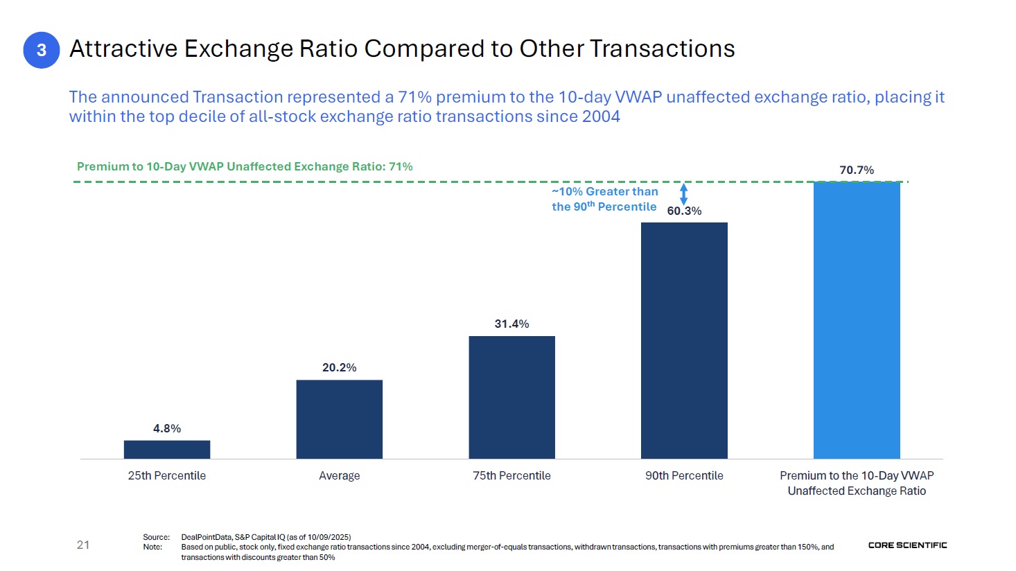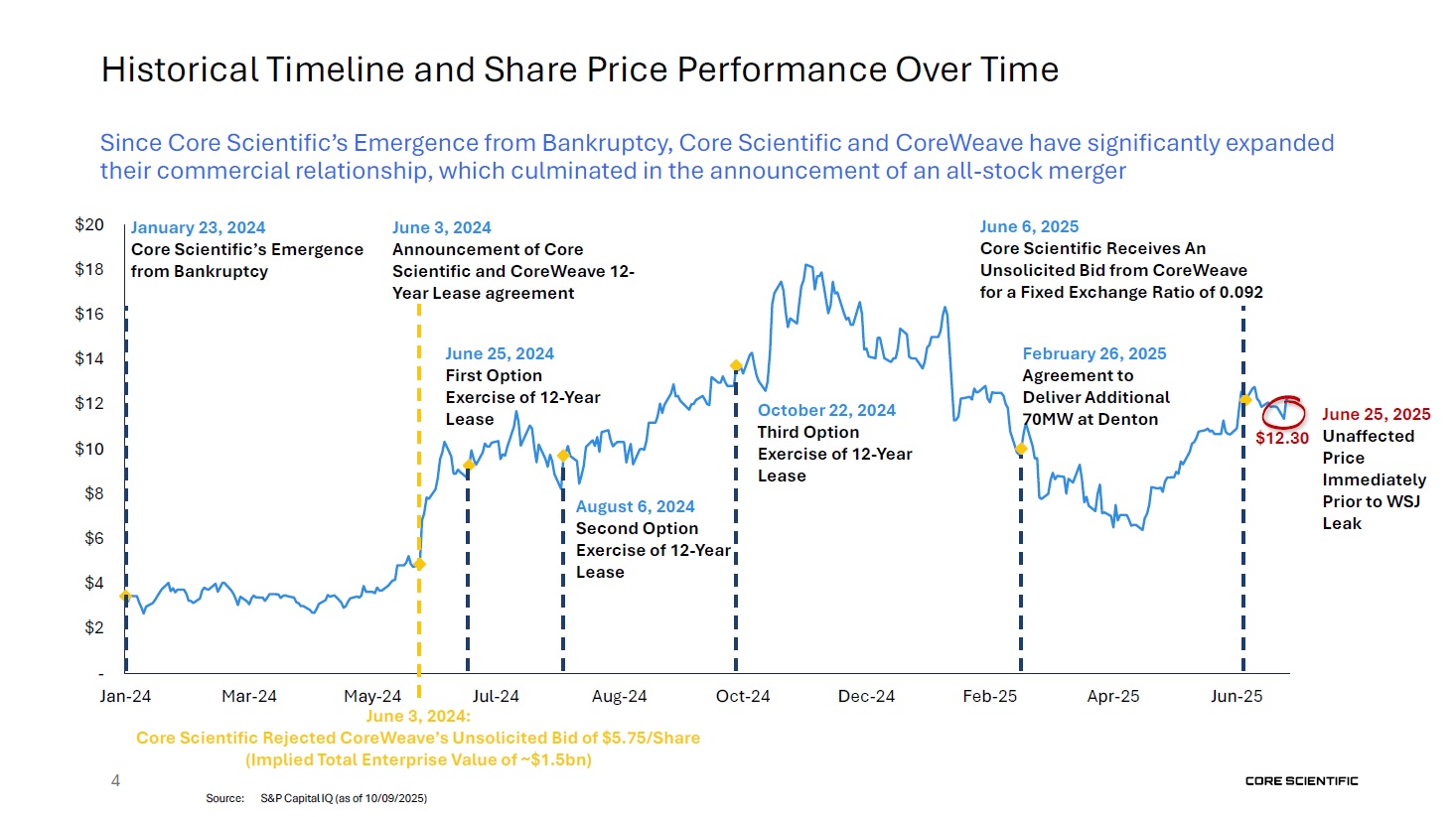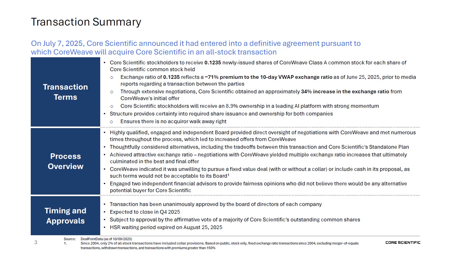 Transaction Summary  Transaction Terms  Core Scientific stockholders to receive 0.1235 newly-issued shares of CoreWeave Class A common stock for each share of  Core Scientific common stock held  Exchange ratio of 0.1235 reflects a ~71% premium to the 10-day VWAP exchange ratio as of June 25, 2025, prior to media reports regarding a transaction between the parties  Through extensive negotiations, Core Scientific obtained an approximately 34% increase in the exchange ratio from CoreWeave's initial offer  Core Scientific stockholders will receive an 8.9% ownership in a leading AI platform with strong momentum  Structure provides certainty into required share issuance and ownership for both companies  Ensures there is no acquiror walk away right  Process Overview  Highly qualified, engaged and independent Board provided direct oversight of negotiations with CoreWeave and met numerous times throughout the process, which led to increased offers from CoreWeave  Thoughtfully considered alternatives, including the tradeoffs between this transaction and Core Scientific’s Standalone Plan  Achieved attractive exchange ratio – negotiations with CoreWeave yielded multiple exchange ratio increases that ultimately culminated in the best and final offer  CoreWeave indicated it was unwilling to pursue a fixed value deal (with or without a collar) or include cash in its proposal, as such terms would not be acceptable to its Board1  Engaged two independent financial advisors to provide fairness opinions who did not believe there would be any alternative potential buyer for Core Scientific  Timing and Approvals  Transaction has been unanimously approved by the board of directors of each company  Expected to close in Q4 2025  Subject to approval by the affirmative vote of a majority of Core Scientific’s outstanding common shares  HSR waiting period expired on August 25, 2025  On July 7, 2025, Core Scientific announced it had entered into a definitive agreement pursuant to which CoreWeave will acquire Core Scientific in an all-stock transaction  3  Source: DealPointData (as of 10/09/2025)  1.  Since 2004, only 2% of all stock transactions have included collar provisions. Based on public, stock only, fixed exchange ratio transactions since 2004, excluding merger-of-equals transactions, withdrawn transactions, and transactions with premiums greater than 150%