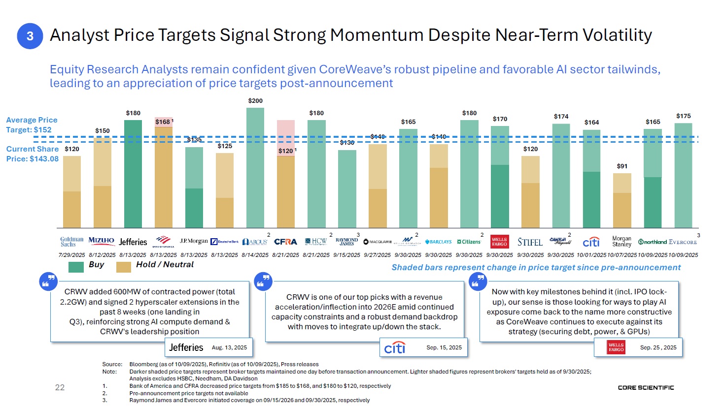$120  $150  $135  $125  Equity Research Analysts remain confident given CoreWeave’s robust pipeline and favorable AI sector tailwinds, leading to an appreciation of price targets post-announcement  $200  $120  1  $130  $140 $140  $180 $180 $180  $168 1 $165  $170  $120  $174  $91  $164 $165  $175  22  Analyst Price Targets Signal Strong Momentum Despite Near-Term Volatility  Source: Note:  Bloomberg (as of 10/09/2025), Refinitiv (as of 10/09/2025), Press releases  Darker shaded price targets represent broker targets maintained one day before transaction announcement. Lighter shaded figures represent brokers' targets held as of 9/30/2025; Analysis excludes HSBC, Needham, DA Davidson  Bank of America and CFRA decreased price targets from $185 to $168, and $180 to $120, respectively Pre-announcement price targets not available  Raymond James and Evercore initiated coverage on 09/15/2026 and 09/30/2025, respectively  1.  2.  3.  CRWV added 600MW of contracted power (total 2.2GW) and signed 2 hyperscaler extensions in the past 8 weeks (one landing in  Q3), reinforcing strong AI compute demand &  CRWV's leadership position  Aug. 13, 2025  CRWV is one of our top picks with a revenue acceleration/inflection into 2026E amid continued capacity constraints and a robust demand backdrop with moves to integrate up/down the stack.  Sep. 15, 2025  Now with key milestones behind it (incl. IPO lock- up), our sense is those looking for ways to play AI exposure come back to the name more constructive as CoreWeave continues to execute against its strategy (securing debt, power, & GPUs)  Sep. 25 , 2025  Buy Hold / Neutral  Shaded bars represent change in price target since pre-announcement  Average Price  Target: $152  Current Share Price: $143.08  2  2  2  3  2  2  7/29/2025 8/12/2025 8/13/2025 8/13/2025 8/13/2025 8/13/2025 8/14/2025 8/21/2025 8/21/2025 9/15/2025 9/27/2025 9/30/2025 9/30/2025 9/30/2025 9/30/2025 9/30/2025 9/30/2025 10/01/202510/07/202510/09/202510/09/2025  3  3