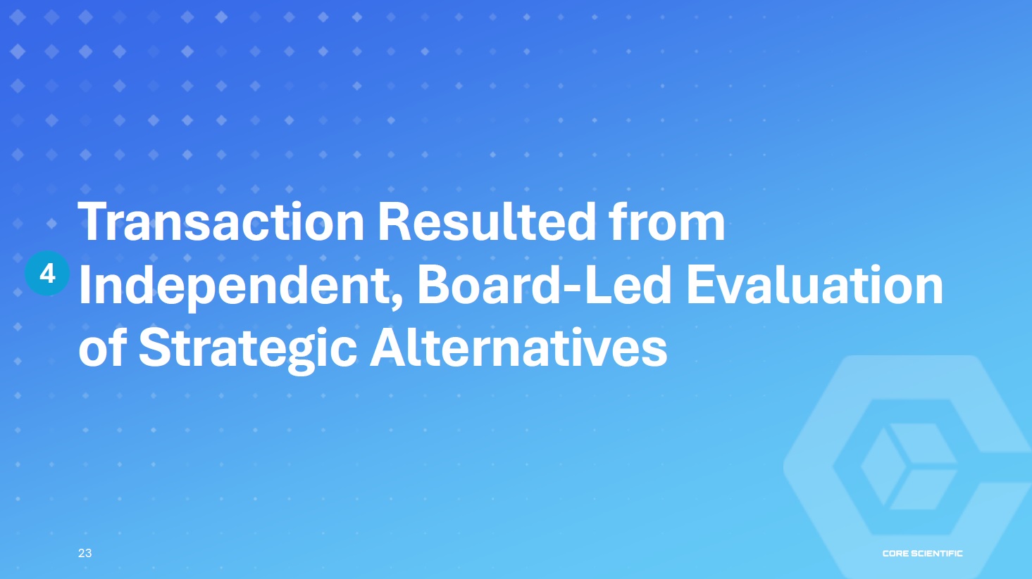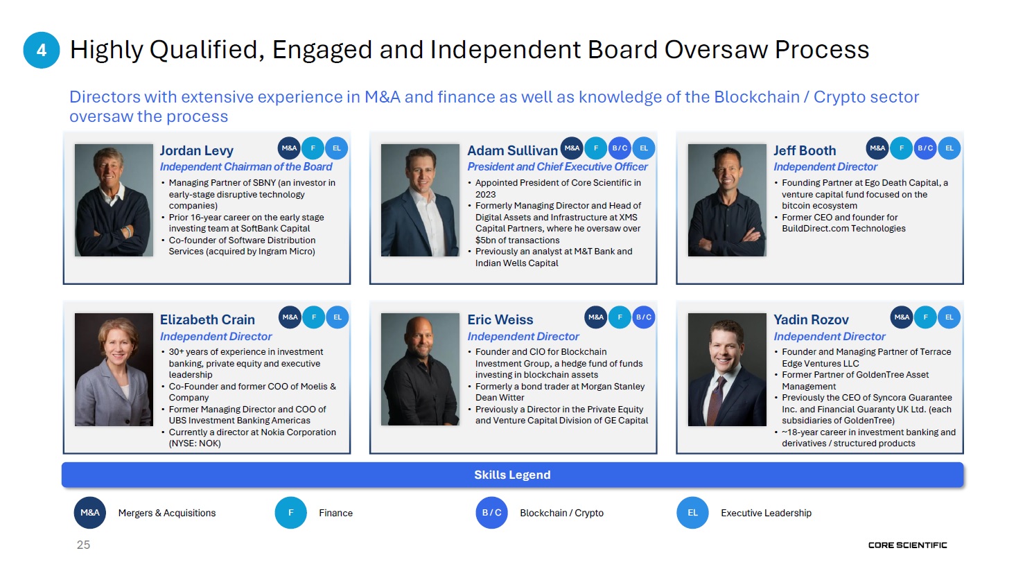 Highly Qualified, Engaged and Independent Board Oversaw Process  Independent Chairman of the Board  Managing Partner of SBNY (an investor in early-stage disruptive technology companies)  Prior 16-year career on the early stage  investing team at SoftBank Capital  Co-founder of Software Distribution Services (acquired by Ingram Micro)  President and Chief Executive Officer  Appointed President of Core Scientific in 2023  Formerly Managing Director and Head of Digital Assets and Infrastructure at XMS Capital Partners, where he oversaw over  $5bn of transactions  Previously an analyst at M&T Bank and Indian Wells Capital  Independent Director  Founding Partner at Ego Death Capital, a venture capital fund focused on the bitcoin ecosystem  Former CEO and founder for  BuildDirect.com Technologies  Elizabeth Crain M&A F EL  Independent Director  30+ years of experience in investment banking, private equity and executive leadership  Co-Founder and former COO of Moelis & Company  Former Managing Director and COO of UBS Investment Banking Americas  Currently a director at Nokia Corporation (NYSE: NOK)  Eric Weiss M&A F B / C  Independent Director  Founder and CIO for Blockchain Investment Group, a hedge fund of funds investing in blockchain assets  Formerly a bond trader at Morgan Stanley Dean Witter  Previously a Director in the Private Equity and Venture Capital Division of GE Capital  Yadin Rozov M&A F EL  Independent Director  Founder and Managing Partner of Terrace  Edge Ventures LLC  Former Partner of GoldenTree Asset Management  Previously the CEO of Syncora Guarantee Inc. and Financial Guaranty UK Ltd. (each subsidiaries of GoldenTree)  ~18-year career in investment banking and derivatives / structured products  Skills Legend  Directors with extensive experience in M&A and finance as well as knowledge of the Blockchain / Crypto sector oversaw the process  Mergers & Acquisitions  M&A•  F • Finance  Blockchain / Crypto  B / C•  EL • Executive Leadership  Jordan Levy Adam Sullivan M&A Jeff Booth  M&A F EL F B / C EL  M&A F B / C EL  4  23