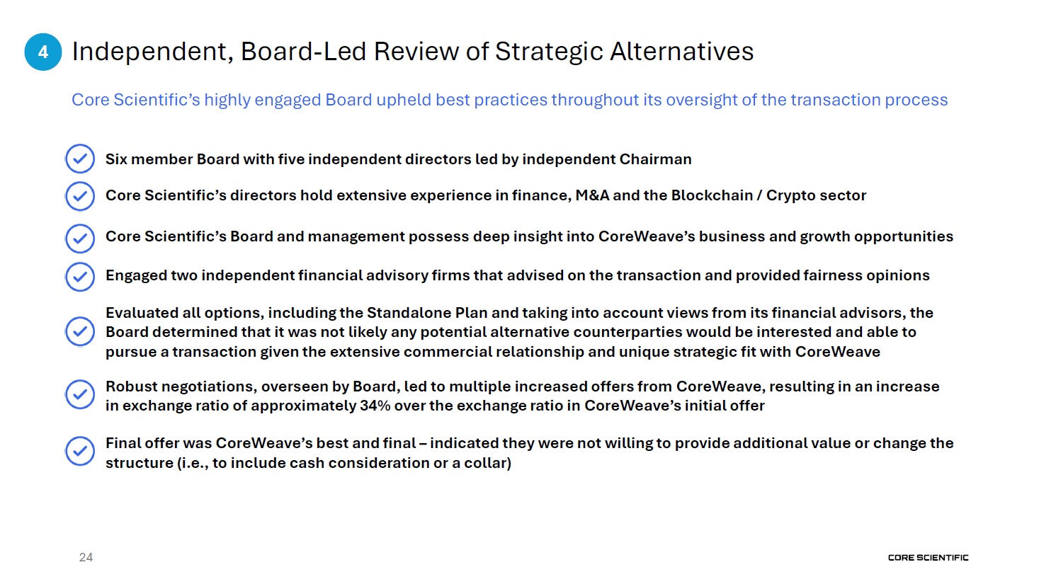 Core Scientific’s highly engaged Board upheld best practices throughout its oversight of the transaction process  Six member Board with five independent directors led by independent Chairman  Core Scientific’s directors hold extensive experience in finance, M&A and the Blockchain / Crypto sector  Core Scientific’s Board and management possess deep insight into CoreWeave’s business and growth opportunities Engaged two independent financial advisory firms that advised on the transaction and provided fairness opinions Evaluated all options, including the Standalone Plan and taking into account views from its financial advisors, the  Board determined that it was not likely any potential alternative counterparties would be interested and able to pursue a transaction given the extensive commercial relationship and unique strategic fit with CoreWeave  Robust negotiations, overseen by Board, led to multiple increased offers from CoreWeave, resulting in an increase in exchange ratio of approximately 34% over the exchange ratio in CoreWeave’s initial offer  Final offer was CoreWeave’s best and final – indicated they were not willing to provide additional value or change the structure (i.e., to include cash consideration or a collar)  4  Independent, Board-Led Review of Strategic Alternatives  23