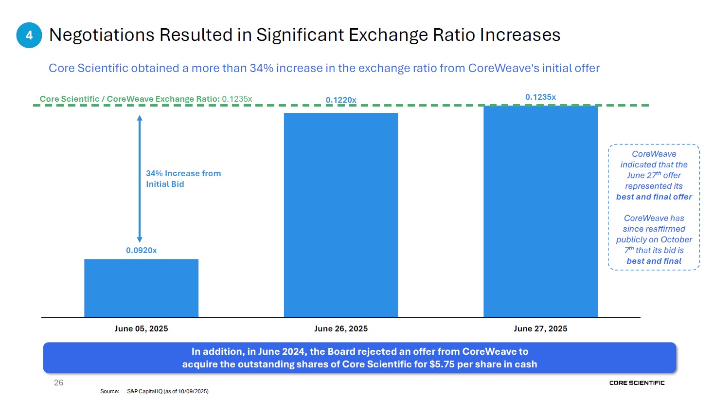 0.0920x  0.1220x  0.1235x  June 05, 2025  Negotiations Resulted in Significant Exchange Ratio Increases  Core Scientific / CoreWeave Exchange Ratio: 0.1235x  34% Increase from Initial Bid  CoreWeave indicated that the June 27th offer represented its best and final offer  CoreWeave has since reaffirmed publicly on October 7th that its bid is best and final  26  Core Scientific obtained a more than 34% increase in the exchange ratio from CoreWeave's initial offer  4  June 26, 2025 June 27, 2025  In addition, in June 2024, the Board rejected an offer from CoreWeave to  acquire the outstanding shares of Core Scientific for $5.75 per share in cash  Source: S&P Capital IQ (as of 10/09/2025)