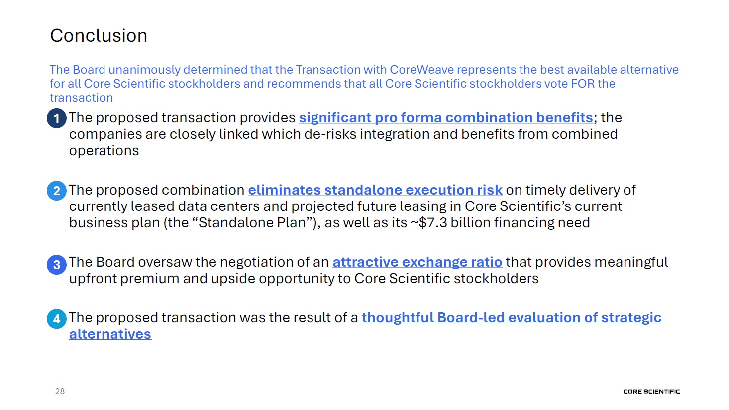 Conclusion  The Board unanimously determined that the Transaction with CoreWeave represents the best available alternative for all Core Scientific stockholders and recommends that all Core Scientific stockholders vote FOR the transaction  1 The proposed transaction provides significant pro forma combination benefits; the companies are closely linked which de-risks integration and benefits from combined operations  2 The proposed combination eliminates standalone execution risk on timely delivery of  currently leased data centers and projected future leasing in Core Scientific’s current business plan (the “Standalone Plan”), as well as its ~$7.3 billion financing need  3 The Board oversaw the negotiation of an attractive exchange ratio that provides meaningful upfront premium and upside opportunity to Core Scientific stockholders  4 The proposed transaction was the result of a thoughtful Board-led evaluation of strategic  alternatives  27