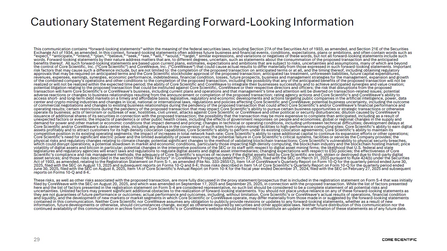 This communication contains “forward-looking statements” within the meaning of the federal securities laws, including Section 27A of the Securities Act of 1933, as amended, and Section 21E of the Securities  27  Exchange Act of 1934, as amended. In this context, forward-looking statements often address future business and financial events, conditions, expectations, plans or ambitions, and often contain words such as  “expect,” “anticipate,” “intend,” “plan,” “believe,” “seek,” “see,” “will,” “would,” “target,” similar expressions, and variations or negatives of these words, but not all forward-looking statements include such  words. Forward-looking statements by their nature address matters that are, to different degrees, uncertain, such as statements about the consummation of the proposed transaction and the anticipated  benefits thereof. All such forward-looking statements are based upon current plans, estimates, expectations and ambitions that are subject to risks, uncertainties and assumptions, many of which are beyond  the control of Core Scientific, Inc. (“Core Scientific”) and CoreWeave, Inc. (“CoreWeave”) that could cause actual results to differ materially from those expressed in such forward-looking statements. Important  risk factors that may cause such a difference include, but are not limited to: the completion of the proposed transaction on anticipated terms or at all, and the timing thereof, including obtaining regulatory  approvals that may be required on anticipated terms and the Core Scientific stockholder approval of the proposed transaction; anticipated tax treatment, unforeseen liabilities, future capital expenditures,  revenues, expenses, earnings, synergies, economic performance, indebtedness, financial condition, losses, future prospects, business and management strategies for the management, expansion and growth  of the combined company’s operations and other conditions to the completion of the proposed transaction, including the possibility that any of the anticipated benefits of the proposed transaction will not be  realized or will not be realized within the expected time period; the ability of Core Scientific and CoreWeave to integrate their businesses successfully and to achieve anticipated synergies and value creation;  potential litigation relating to the proposed transaction that could be instituted against Core Scientific, CoreWeave or their respective directors and officers; the risk that disruptions from the proposed  transaction will harm Core Scientific’s or CoreWeave’s business, including current plans and operations and that management’s time and attention will be diverted on transaction-related issues; potential  adverse reactions or changes to business relationships resulting from the announcement or completion of the proposed transaction; rating agency actions and Core Scientific’s and CoreWeave’s ability to  access short- and long-term debt markets on a timely and affordable basis; legislative, regulatory and economic developments and actions targeting public companies in the artificial intelligence, power, data  center and crypto mining industries and changes in local, national or international laws, regulations and policies affecting Core Scientific and CoreWeave; potential business uncertainty, including the outcome  of commercial negotiations and changes to existing business relationships during the pendency of the proposed transaction that could affect Core Scientific’s and/or CoreWeave’s financial performance and  operating results; certain restrictions during the pendency of the proposed transaction that may impact Core Scientific’s ability to pursue certain business opportunities or strategic transactions or otherwise  operate its business; acts of terrorism or outbreak of war, hostilities, civil unrest, attacks against Core Scientific or CoreWeave and other political or security disturbances; dilution caused by CoreWeave’s  issuance of additional shares of its securities in connection with the proposed transaction; the possibility that the transaction may be more expensive to complete than anticipated, including as a result of  unexpected factors or events; the impacts of pandemics or other public health crises, including the effects of government responses on people and economies; global or regional changes in the supply and  demand for power and other market or economic conditions that impact demand and pricing; changes in technical or operating conditions, including unforeseen technical difficulties; development delays at  Core Scientific and/or CoreWeave’s data center sites, including any delays in the conversion of such sites from crypto mining facilities to high-performance computing sites; Core Scientific’s ability to earn digital  assets profitably and to attract customers for its high density colocation capabilities; Core Scientific’s ability to perform under its existing colocation agreements; Core Scientific’s ability to maintain its  competitive position in its existing operating segments; the impact of increases in total network hash rate; Core Scientific’s ability to raise additional capital to continue its expansion efforts or other operations;  Core Scientific’s need for significant electric power and the limited availability of power resources; the potential failure in Core Scientific’s critical systems, facilities or services the Company provides; the  physical risks and regulatory changes relating to climate change; potential significant changes to the method of validating blockchain transactions; Core Scientific’s vulnerability to physical security breaches,  which could disrupt operations; a potential slowdown in market and economic conditions, particularly those impacting high density computing, the blockchain industry and the blockchain hosting market; price  volatility