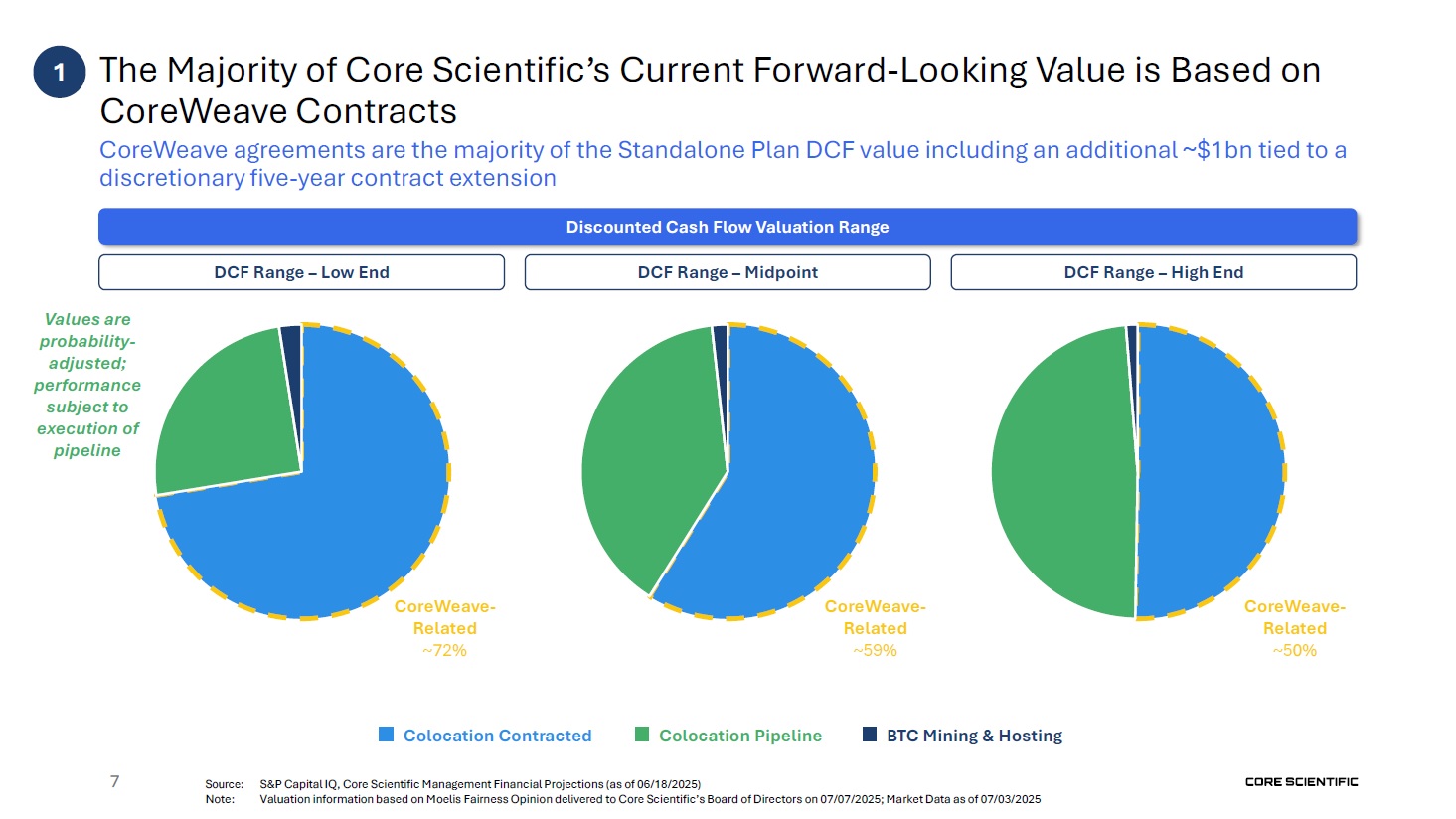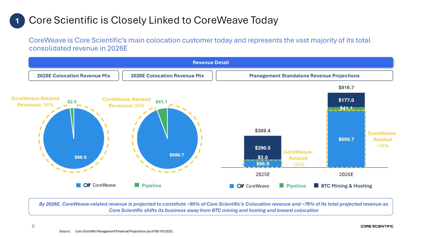 Core Scientific is Closely Linked to CoreWeave Today  CoreWeave is Core Scientific’s main colocation customer today and represents the vast majority of its total  consolidated revenue in 2026E  Revenue Detail  $96.9  $698.7  $290.5  $2.0  $177.0  $41.1  $389.4  $916.7  2025E  2026E  BTC Mining & Hosting  Management Standalone Revenue Projections  2025E Colocation Revenue Mix  2026E Colocation Revenue Mix  CoreWeave-Related  Revenues: 98%  CoreWeave-Related Revenues: 95%  $698.7  $41.1  $96.9  $2.0  Pipeline  Pipeline  By 2026E, CoreWeave-related revenue is projected to constitute ~95% of Core Scientific’s Colocation revenue and ~76% of its total projected revenue as Core Scientific shifts its business away from BTC mining and hosting and toward colocation  CoreWeave-  Related  ~25%  CoreWeave- Related  ~76%  1  6  Source: Core Scientific Management Financial Projections (as of 06/18/2025)