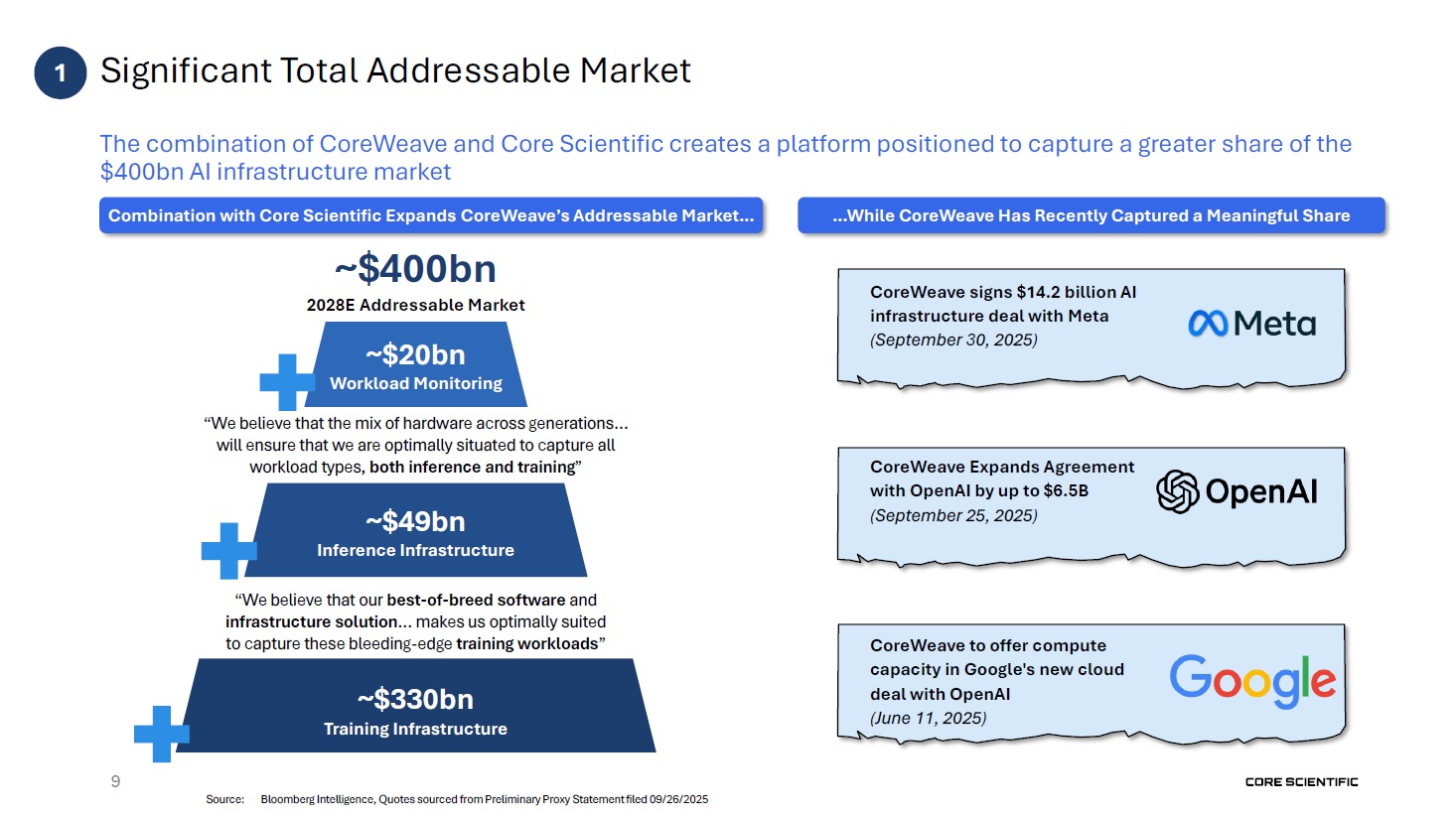 Significant Total Addressable Market  9  ~$400bn  2028E Addressable Market  ~$330bn  Training Infrastructure  ~$49bn  Inference Infrastructure  ~$20bn  Workload Monitoring  The combination of CoreWeave and Core Scientific creates a platform positioned to capture a greater share of the  $400bn AI infrastructure market  Combination with Core Scientific Expands CoreWeave’s Addressable Market… …While CoreWeave Has Recently Captured a Meaningful Share  CoreWeave Expands Agreement with OpenAI by up to $6.5B (September 25, 2025)  CoreWeave signs $14.2 billion AI infrastructure deal with Meta (September 30, 2025)  CoreWeave to offer compute capacity in Google's new cloud deal with OpenAI  (June 11, 2025)  “We believe that our best-of-breed software and infrastructure solution… makes us optimally suited to capture these bleeding-edge training workloads”  “We believe that the mix of hardware across generations… will ensure that we are optimally situated to capture all workload types, both inference and training”  1  Source: Bloomberg Intelligence, Quotes sourced from Preliminary Proxy Statement filed 09/26/2025