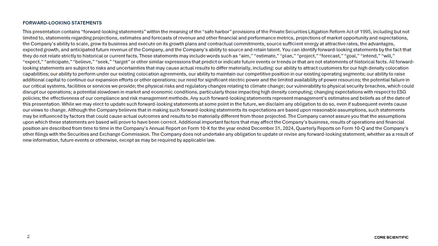 2  FORWARD-LOOKING STATEMENTS  This presentation contains “forward-looking statements” within the meaning of the “safe harbor” provisions of the Private Securities Litigation Reform Act of 1995, including but not limited to, statements regarding projections, estimates and forecasts of revenue and other financial and performance metrics, projections of market opportunity and expectations, the Company’s ability to scale, grow its business and execute on its growth plans and contractual commitments, source sufficient energy at attractive rates, the advantages,  expected growth, and anticipated future revenue of the Company, and the Company’s ability to source and retain talent. You can identify forward-looking statements by the fact that they do not relate strictly to historical or current facts. These statements may include words such as “aim,” “estimate,” “plan,” “project,” “forecast,” “goal,” “intend,” “will,” “expect,” “anticipate,” “believe,” “seek,” “target” or other similar expressions that predict or indicate future events or trends or that are not statements of historical facts. All forward-looking statements are subject to risks and uncertainties that may cause actual results to differ materially, including: our ability to attract customers for our high density colocation capabilities; our ability to perform under our existing colocation agreements, our ability to maintain our competitive position in our existing operating segments; our ability to raise additional capital to continue our expansion efforts or other operations; our need for significant electric power and the limited availability of power resources; the potential failure in our critical systems, facilities or services we provide; the physical risks and regulatory changes relating to climate change; our vulnerability to physical security breaches, which could disrupt our operations; a potential slowdown in market and economic conditions, particularly those impacting high density computing; changing expectations with respect to ESG policies; the effectiveness of our compliance and risk management methods. Any such forward-looking statements represent management’s estimates and beliefs as of the date of this presentation. While we may elect to update such forward-looking statements at some point in the future, we disclaim any obligation to do so, even if subsequent events cause our views to change. Although the Company believes that in making such forward-looking statements its expectations are based upon reasonable assumptions, such statements may be influenced by factors that could cause actual outcomes and results to be materially different from those projected. The Company cannot assure you that the assumptions upon which these statements are based will prove to have been correct. Additional important factors that may affect the Company’s business, results of operations and financial  position are described from time to time in the Company’s Annual Report on Form 10-K for the year ended December 31, 2024, Quarterly Reports on Form 10-Q and the Company’s other filings with the Securities and Exchange Commission. The Company does not undertake any obligation to update or revise any forward-looking statement, whether as a result of new information, future events or otherwise, except as may be required by applicable law.