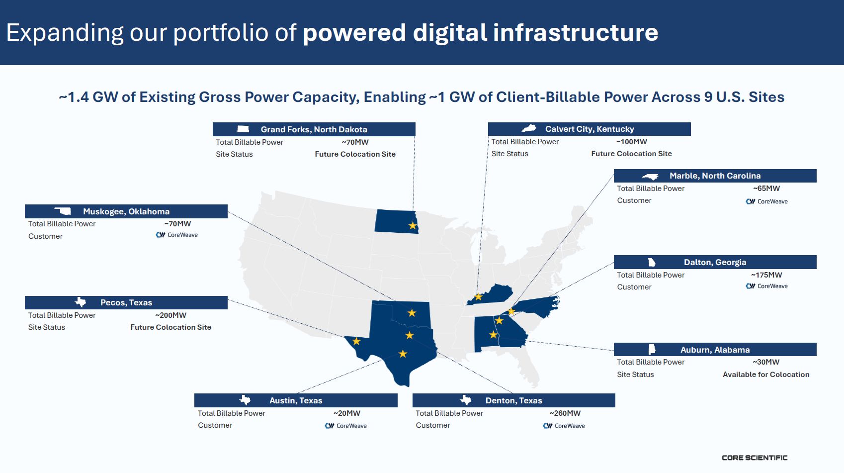 Expanding our portfolio of powered digital infrastructure  Denton, Texas  Total Billable Power  ~260MW  Customer  Pecos, Texas  Total Billable Power  ~200MW  Site Status  Future Colocation Site  Dalton, Georgia  Total Billable Power  ~175MW  Customer  Calvert City, Kentucky  Total Billable Power  ~100MW  Site Status  Future Colocation Site  Muskogee, Oklahoma  Total Billable Power ~70MW  Customer  Marble, North Carolina  Total Billable Power  ~65MW  Customer  Grand Forks, North Dakota  Total Billable Power Site Status  ~70MW  Future Colocation Site  Auburn, Alabama  Total Billable Power  ~30MW  Site Status  Available for Colocation  Austin, Texas  Total Billable Power  ~20MW  Customer  ~1.4 GW of Existing Gross Power Capacity, Enabling ~1 GW of Client-Billable Power Across 9 U.S. Sites