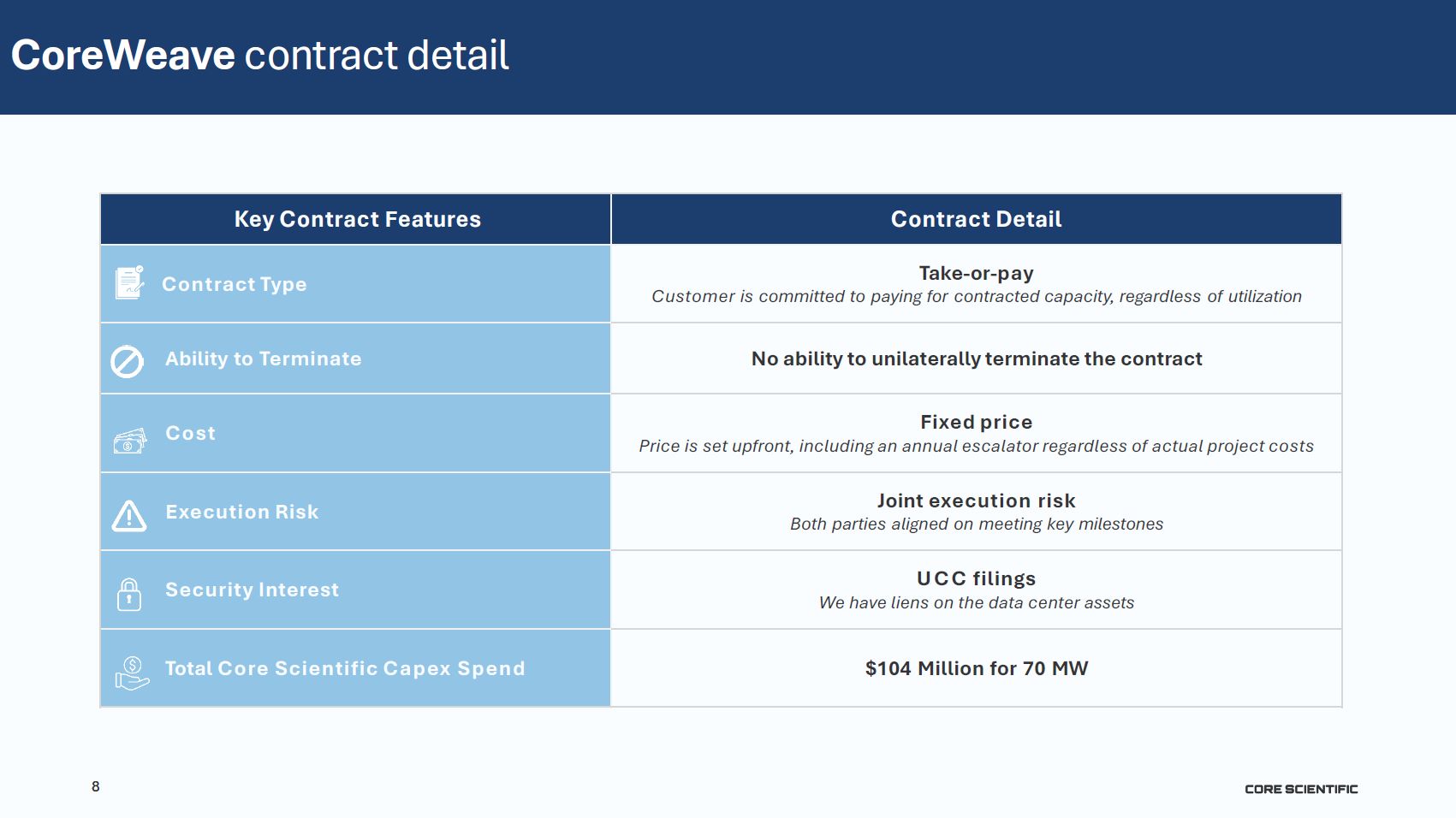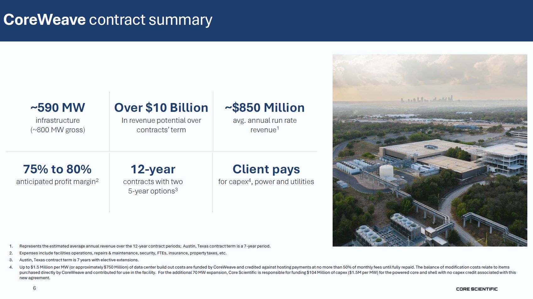 ~590 MW  infrastructure (~800 MW gross)  Over $10 Billion  In revenue potential over  contracts’ term  ~$850 Million  avg. annual run rate revenue1  75% to 80%  anticipated profit margin2  12-year  contracts with two 5-year options3  Client pays  for capex4, power and utilities  CoreWeave contract summary  Represents the estimated average annual revenue over the 12-year contract periods; Austin, Texas contract term is a 7-year period.  Expenses include facilities operations, repairs & maintenance, security, FTEs, insurance, property taxes, etc.  Austin, Texas contract term is 7 years with elective extensions.  Up to $1.5 Million per MW (or approximately $750 Million) of data center build out costs are funded by CoreWeave and credited against hosting payments at no more than 50% of monthly fees until fully repaid. The balance of modification costs relate to items purchased directly by CoreWeave and contributed for use in the facility. For the additional 70 MW expansion, Core Scientific is responsible for funding $104 Million of capex ($1.5M per MW) for the powered core and shell with no capex credit associated with this new agreement.  6