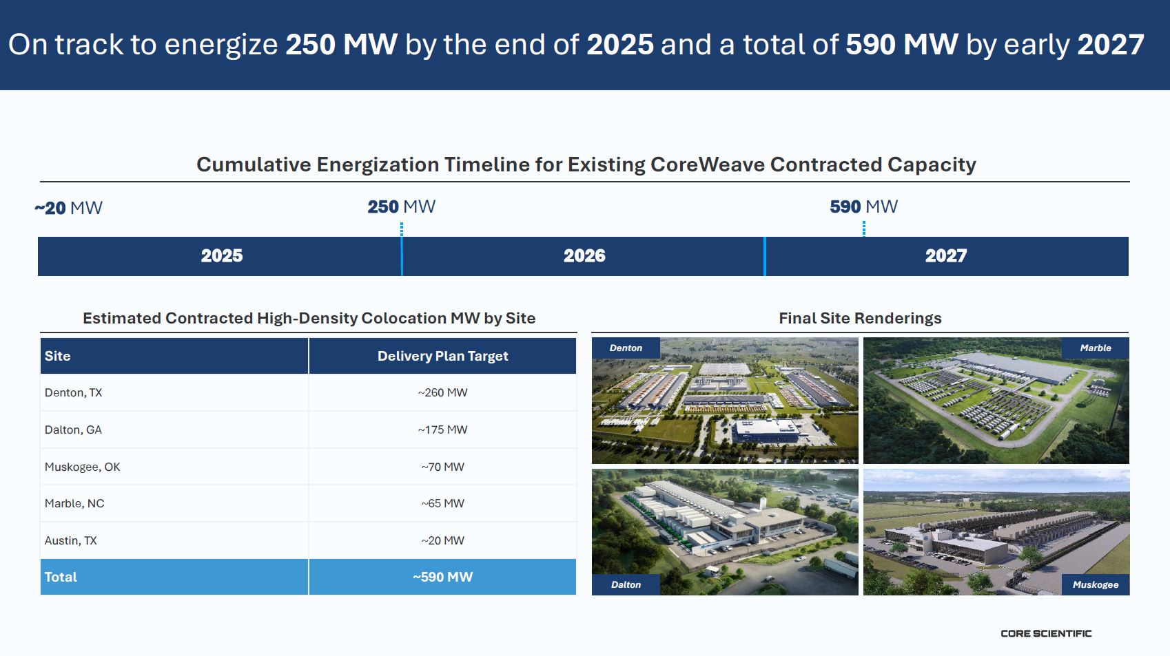 On track to energize 250 MW by the end of 2025 and a total of 590 MW by early 2027  ~20 MW  Site  Delivery Plan Target  Denton, TX  ~260 MW  Dalton, GA  ~175 MW  Muskogee, OK  ~70 MW  Marble, NC  ~65 MW  Austin, TX  ~20 MW  Total  ~590 MW  Estimated Contracted High-Density Colocation MW by Site  Final Site Renderings  2025  2026  2027  Denton  Marble  Dalton  Muskogee  Cumulative Energization Timeline for Existing CoreWeave Contracted Capacity  250 MW 590 MW