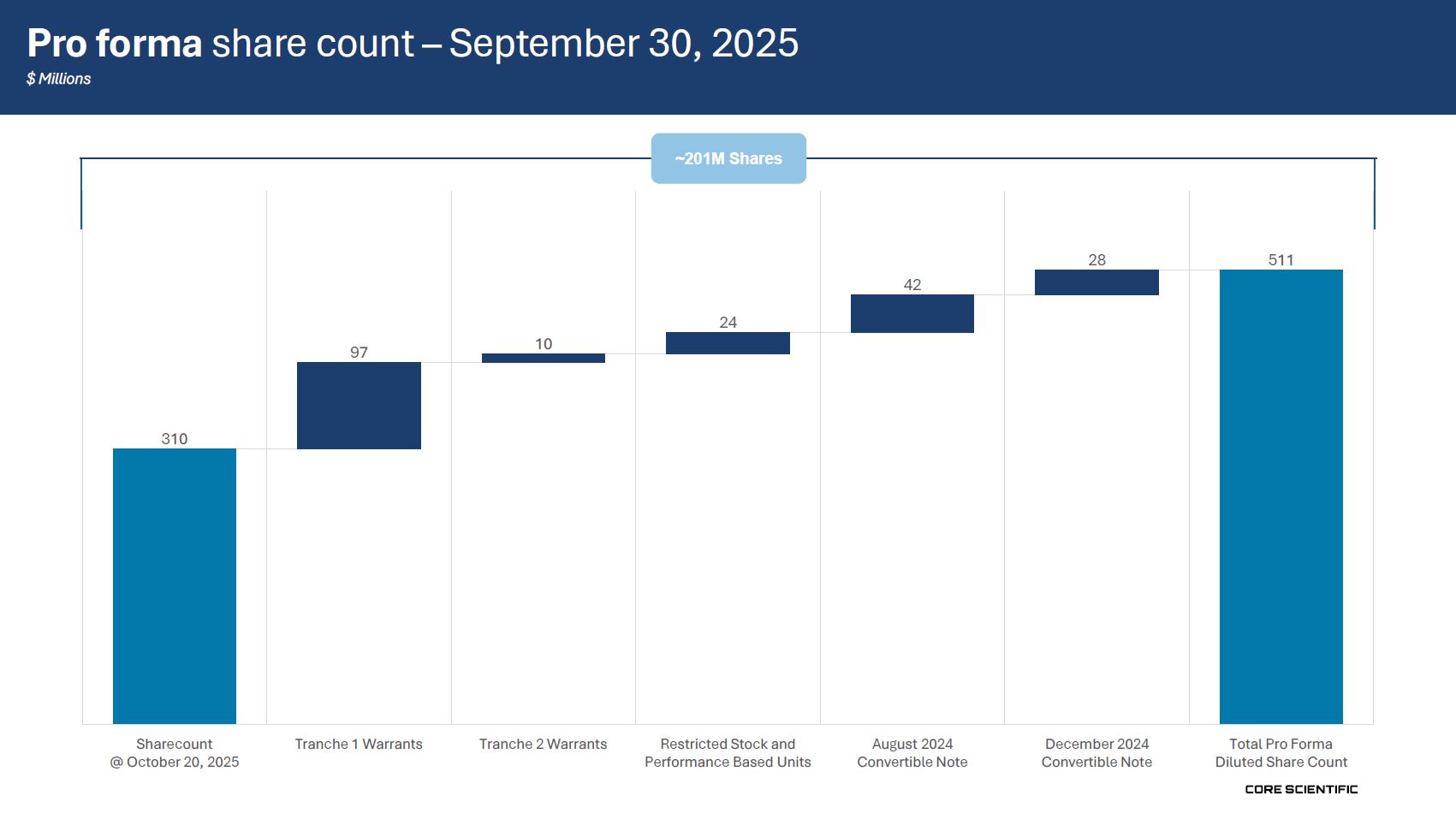 Pro forma share count – September 30, 2025  $ Millions  310  97  10  24  42  28  511  Sharecount  Tranche 1 Warrants  Tranche 2 Warrants  Restricted Stock and  August 2024  December 2024  Total Pro Forma  @ October 20, 2025  Performance Based Units  Convertible Note  Convertible Note  Diluted Share Count  ~201M Shares