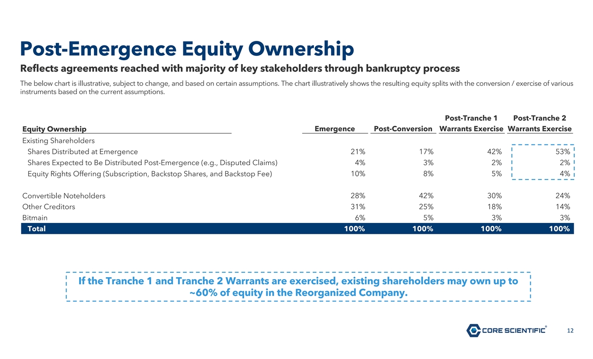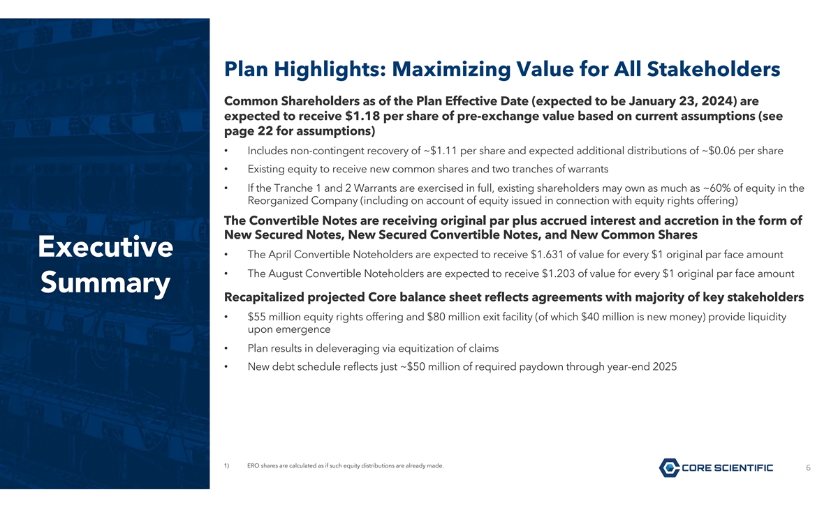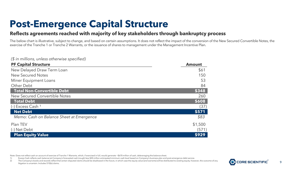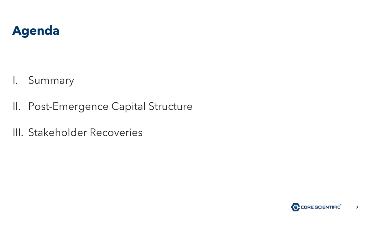 Legal Disclaimer This document is solely for informational purposes. You should not rely upon it or use it to form the definitive basis for any decision or action whatsoever, with respect to any proposed transaction or otherwise. This document is “as is” and neither Core Scientific, Inc. (the “Company”) nor any affiliates or agents of the Company, make any representation or warranty, express or implied, in relation to the accuracy or completeness of the information contained in this document or any oral information provided in connection herewith, or any data it generates and expressly disclaim any and all liability (whether direct or indirect, in contract, tort or otherwise) in relation to any of such information or any errors or omissions therein. All share and warrant numbers in this document are rounded down to the nearest whole share or warrant, as applicable, which reflects that no fractional shares or warrants will be issued in connection with the Company’s Chapter 11 Plan. You are encouraged to read the Company’s Chapter 11 Plan and the related Disclosure Statement, each as amended or supplemented, which are available (i) on the website of Stretto, the Company’s voting and solicitation agent, at https://cases.stretto.com/corescientific/, (ii) by calling Stretto at (949) 404-4152 (in the U.S. and Canada; toll-free) or +1 (888) 765-7875 (outside of the U.S. and Canada), or (iii) by sending an electronic mail message to CoreScientificInquiries@stretto.com. This document does not constitute an offer to sell or the solicitation of an offer to buy any security, nor does it constitute an offer or commitment to lend, syndicate or arrange a financing, underwrite or purchase or act as an agent or advisor or in any other capacity with respect to any transaction, or commit capital, or to participate in any trading strategies, and does not constitute legal, regulatory, accounting or tax advice to the recipient. This document does not constitute and should not be considered as any form of legal or financial opinion or recommendation by the Company or any of its affiliates. This document is not a research report nor should it be construed as such. The document, including any projections and forecasts, was not prepared with a view toward public disclosure or compliance with the published guidelines of the Securities and Exchange Commission (“SEC”) or the guidelines established by the Public Company Accounting Oversight Board and should not be relied upon to make an investment decision with respect to the Company. This document does not purport to present the Company’s financial condition in accordance with GAAP. The Company’s independent registered public accounting firm has not examined, compiled or otherwise applied procedures to this document and, accordingly, does not express an opinion or any other form of assurance with respect to this document. Any projections or forecasts were prepared for internal use, capital budgeting and other management decisions and are subjective in many respects. Any such projections or forecasts reflect numerous assumptions made by management of the Company with respect to financial condition, business and industry performance, general economic, market and financial conditions, and other matters, all of which are difficult to predict, and many of which are beyond the Company’s control. The disclosure of this document should not be regarded as an indication that the Company or its affiliates or representatives consider this document to be a reliable prediction of future events, and this document should not be relied upon as such. The statements in this document speak only as of the date such statements were made, or any earlier date indicated therein. Neither the Company nor any of its affiliates or representatives has made or makes any representation to any person regarding the ultimate outcome of the foregoing, and none of them undertakes any obligation to publicly update this document to reflect circumstances existing after the date when this document was made available to stakeholders or to reflect the occurrence of future events, even in the event that any or all of the assumptions underlying this document are shown to be in error. The statements provided in this document are subject to all of the cautionary statements and limitations described herein, therein and under the caption “Forward-Looking Statements” and the risk factors in the Company’s SEC filings. Forward-Looking Statements This document contains forward-looking statements within the meaning of the Private Securities Litigation Reform Act of 1995. Such statements include, but are not limited to, statements about plans, expectations and intentions with respect to the future and other statements identified by words such as will likely result, are expected to, will continue, is anticipated, estimated, believe, intend, plan, projection, “forecast,” outlook or words of similar meaning. Such forward-looking statements are based upon the current beliefs and expectations of the management of the Company and are inherently subject to significant contingencies, many of which are difficult to predict and generally beyond the control of the parties. Actual performance or achievements may differ materially, and potentially adversely, from any forward-looking statements and the assumptions on which those forward-looking statements are based. There can be no assurance that the data contained herein is reflective of future performance to any degree. You are cautioned not to place undue reliance on forward-looking statements as a predictor of future performance as such information is based on estimates and assumptions. The forward-looking statements are subject to various risks, uncertainties and other factors, many of which are beyond the Company’s control. 2
