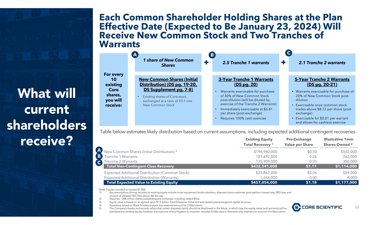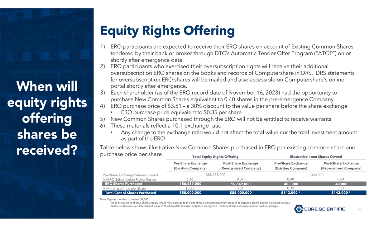 Each Common Shareholder Holding Shares at the Plan Effective Date (Expected to Be January 23, 2024) Will Receive New Common Stock and Two Tranches of Warrants C A B 1 share of New Common 2.5 Tranche 1 warrants 2.1 Tranche 2 warrants Shares For every 10 New Common Shares (Initial 3-Year Tranche 1 Warrants 5-Year Tranche 2 Warrants existing Distribution) (DS pg. 19-20, (DS pg. 20) (DS pg. 20-21) Core DS Supplement pg. 7-8) • Warrants exercisable for purchase • Warrants exercisable for purchase of shares, of 30% of New Common Stock 20% of New Common Stock post- What will • Existing shares of Core stock post-dilution (will be diluted by dilution you will exchanged at a ratio of 10:1 into exercise of the Tranche 2 Warrants) New Common Stock • Exercisable once common stock receive: • Immediately exercisable at $6.81 trades above $8.72 per share (post- current per share (post-exchange) exchange) • Requires 100% cash exercise • Exercisable for $0.01 per warrant and allows for cashless exercise shareholders Table below estimates likely distribution based on current assumptions, including expected additional contingent recoveries ⁽ ⁾ ⁽ ⁾ Existing Equity Pre-Exchange Illustrative 1mm ⁽ ⁾ receive? Total Recovery ¹ Value per Share Shares Owned ² ⁽⁴⁾ A New Common Shares (Initial Distribution) ³ $194,940,000 $0.50 $502,000 ⁽⁴⁾ B Tranche 1 Warrants 101,692,000 0.26 262,000 Tranche 2 Warrants 135,909,000 0.35 350,000 C ⁽⁵⁾ Total Non-Contingent Class Recovery $432,541,000 $1.11 $1,114,000 ⁽⁵⁾ Expected Additional Distribution (Common Stock) $22,867,000 $0.06 $59,000 Expected Additional Distribution (Warrants) 1,646,000 0.00 4,000 Total Expected Value to Existing Equity $457,054,000 $1.18 $1,177,000 Note: Figures rounded to nearest $1,000. 1) Key assumptions driving recovery to existing equity include miner equipment lender elections, disputed claims estimate, post-petition interest rate, ERO size, and amount of allowed OEC fees above the fee cap. 2) Assumes ~388 million shares outstanding pre-exchange, including vested RSUs. 3) Equity value is based on an agreed upon $1.5 billion Total Enterprise Value and anticipated post-emergence capital structure. 4) Illustrative, based on Black Scholes analysis less reserved amount for 510(b) claims. 20 20 5) The Company’s books and records reflect that certain disputed claims should be disallowed in the future, in which case the equity value (and warrants) will be distributed to existing equity; however, the outcome of any litigation is uncertain. Includes 510(b) claims. Warrants only reserved on account of 510(b) claims.