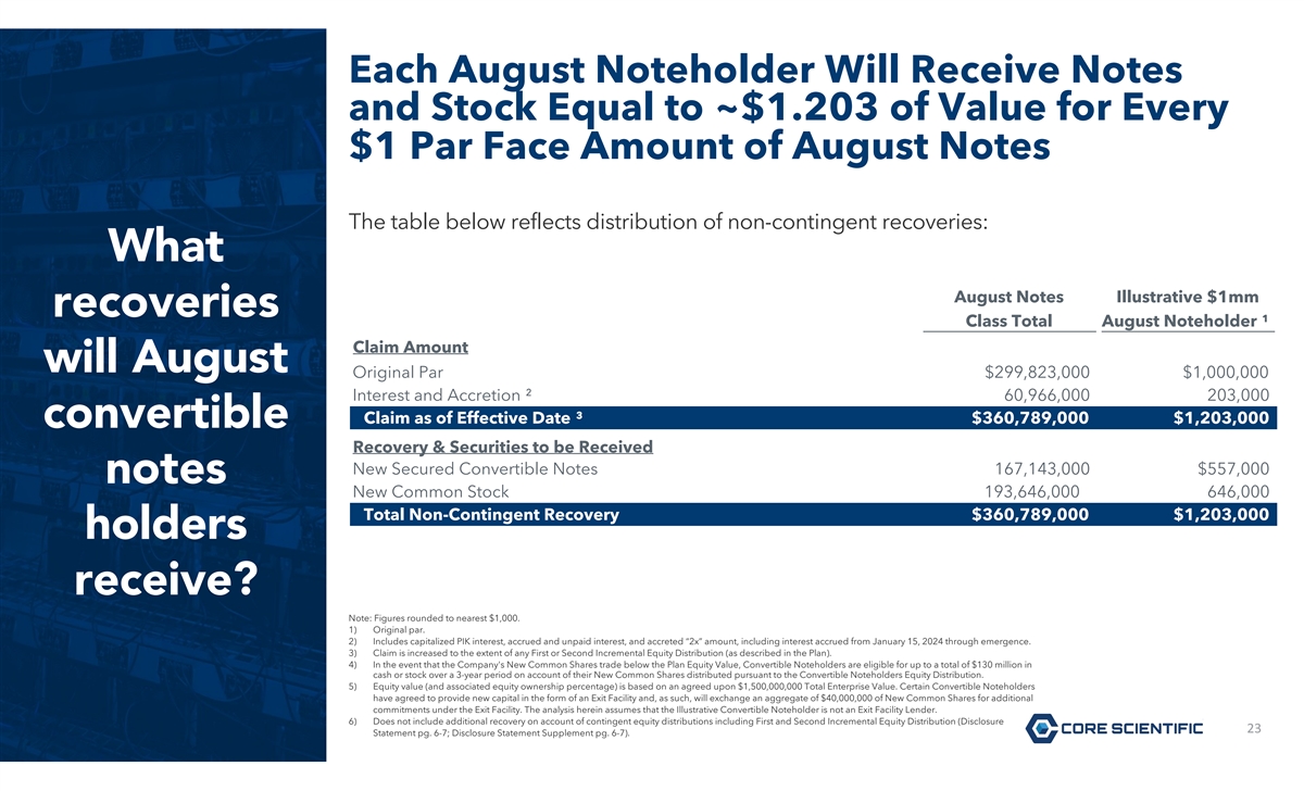 Each August Noteholder Will Receive Notes and Stock Equal to ~$1.203 of Value for Every $1 Par Face Amount of August Notes The table below reflects distribution of non-contingent recoveries: What ⁽ ⁾ August Notes Illustrative $1mm recoveries Class Total August Noteholder ¹ Claim Amount ⁽ ⁾ will August Original Par $299,823,000 $1,000,000 ⁽ ⁾ Interest and Accretion ² 60,966,000 203,000 Claim as of Effective Date ³ $360,789,000 $1,203,000 convertible Recovery & Securities to be Received ⁽⁴⁾ ⁽⁵⁾ New Secured Convertible Notes 167,143,000 $557,000 notes ⁽⁶⁾ New Common Stock 193,646,000 646,000 Total Non-Contingent Recovery $360,789,000 $1,203,000 holders receive? Note: Figures rounded to nearest $1,000. 1) Original par. 2) Includes capitalized PIK interest, accrued and unpaid interest, and accreted “2x” amount, including interest accrued from January 15, 2024 through emergence. 3) Claim is increased to the extent of any First or Second Incremental Equity Distribution (as described in the Plan). 4) In the event that the Company's New Common Shares trade below the Plan Equity Value, Convertible Noteholders are eligible for up to a total of $130 million in cash or stock over a 3-year period on account of their New Common Shares distributed pursuant to the Convertible Noteholders Equity Distribution. 5) Equity value (and associated equity ownership percentage) is based on an agreed upon $1,500,000,000 Total Enterprise Value. Certain Convertible Noteholders have agreed to provide new capital in the form of an Exit Facility and, as such, will exchange an aggregate of $40,000,000 of New Common Shares for additional commitments under the Exit Facility. The analysis herein assumes that the Illustrative Convertible Noteholder is not an Exit Facility Lender. 6) Does not include additional recovery on account of contingent equity distributions including First and Second Incremental Equity Distribution (Disclosure 23 23 Statement pg. 6-7; Disclosure Statement Supplement pg. 6-7).