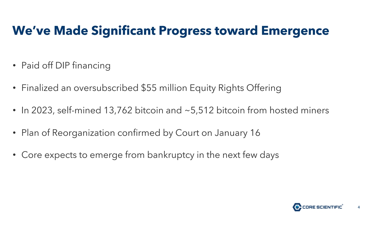Exhibit 99.2 Core Scientific, Inc. Emergence Update* January 22, 2024 * This is only a summary. All shareholders and creditors should read the Plan and Disclosure Statement for details. 1