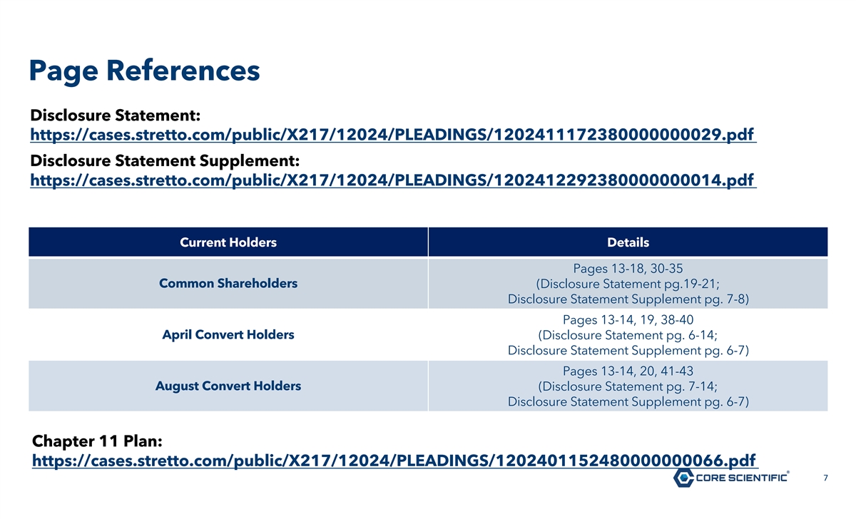 Page References Disclosure Statement: https://cases.stretto.com/public/X217/12024/PLEADINGS/1202411172380000000029.pdf Disclosure Statement Supplement: https://cases.stretto.com/public/X217/12024/PLEADINGS/1202412292380000000014.pdf Current Holders Details Pages 13-18, 30-35 Common Shareholders (Disclosure Statement pg.19-21; Disclosure Statement Supplement pg. 7-8) Pages 13-14, 19, 38-40 April Convert Holders (Disclosure Statement pg. 6-14; Disclosure Statement Supplement pg. 6-7) Pages 13-14, 20, 41-43 August Convert Holders (Disclosure Statement pg. 7-14; Disclosure Statement Supplement pg. 6-7) Chapter 11 Plan: https://cases.stretto.com/public/X217/12024/PLEADINGS/1202401152480000000066.pdf 7