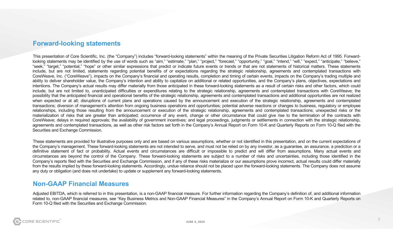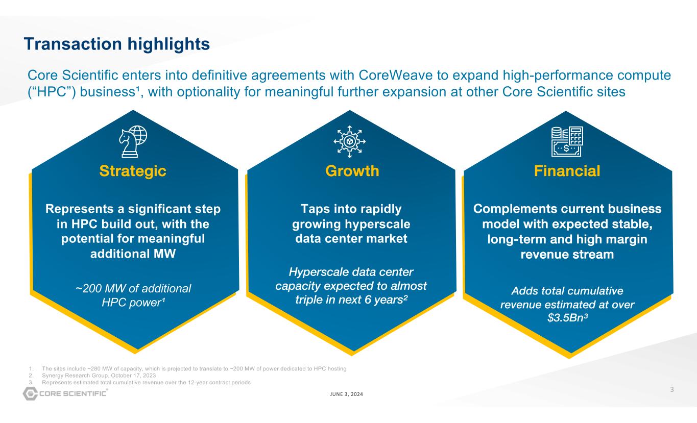 2 JUNE 3, 2024 Forward-looking statements This presentation of Core Scientific, Inc. (the “Company”) includes “forward-looking statements” within the meaning of the Private Securities Litigation Reform Act of 1995. Forward- looking statements may be identified by the use of words such as “aim,” “estimate,” “plan,” “project,” “forecast,” “opportunity,” “goal,” “intend,” “will,” “expect,” “anticipate,” “believe,” “seek,” “target,” “potential,” “hope” or other similar expressions that predict or indicate future events or trends or that are not statements of historical matters. These statements include, but are not limited, statements regarding potential benefits of or expectations regarding the strategic relationship, agreements and contemplated transactions with CoreWeave, Inc. (“CoreWeave”), impacts on the Company’s financial and operating results, completion and timing of certain events, impacts on the Company’s trading multiple and ability to deliver shareholder value, the Company’s intention and ability to capitalize on additional or related opportunities, and the Company’s plans, objectives, expectations and intentions. The Company’s actual results may differ materially from those anticipated in these forward-looking statements as a result of certain risks and other factors, which could include, but are not limited to, unanticipated difficulties or expenditures relating to the strategic relationship, agreements and contemplated transactions with CoreWeave; the possibility that the anticipated financial and operational benefits of the strategic relationship, agreements and contemplated transactions and additional opportunities are not realized when expected or at all; disruptions of current plans and operations caused by the announcement and execution of the strategic relationship, agreements and contemplated transactions; diversion of management’s attention from ongoing business operations and opportunities; potential adverse reactions or changes to business, regulatory or employee relationships, including those resulting from the announcement or execution of the strategic relationship, agreements and contemplated transactions; unexpected risks or the materialization of risks that are greater than anticipated; occurrence of any event, change or other circumstance that could give rise to the termination of the contracts with CoreWeave; delays in required approvals; the availability of government incentives; and legal proceedings, judgments or settlements in connection with the strategic relationship, agreements and contemplated transactions, as well as other risk factors set forth in the Company’s Annual Report on Form 10-K and Quarterly Reports on Form 10-Q filed with the Securities and Exchange Commission. These statements are provided for illustrative purposes only and are based on various assumptions, whether or not identified in this presentation, and on the current expectations of the Company’s management. These forward-looking statements are not intended to serve, and must not be relied on by any investor, as a guarantee, an assurance, a prediction or a definitive statement of fact or probability. Actual events and circumstances are difficult or impossible to predict and will differ from assumptions. Many actual events and circumstances are beyond the control of the Company. These forward-looking statements are subject to a number of risks and uncertainties, including those identified in the Company’s reports filed with the Securities and Exchange Commission, and if any of these risks materialize or our assumptions prove incorrect, actual results could differ materially from the results implied by these forward-looking statements. Accordingly, undue reliance should not be placed upon the forward-looking statements. The Company does not assume any duty or obligation (and does not undertake) to update or supplement any forward-looking statements. Non-GAAP Financial Measures Adjusted EBITDA, which is referred to in this presentation, is a non-GAAP financial measure. For further information regarding the Company’s definition of, and additional information related to, non-GAAP financial measures, see “Key Business Metrics and Non-GAAP Financial Measures” in the Company’s Annual Report on Form 10-K and Quarterly Reports on Form 10-Q filed with the Securities and Exchange Commission.