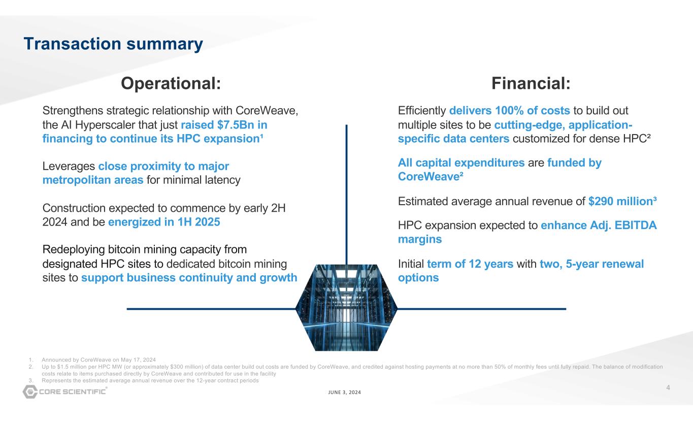 3 JUNE 3, 2024 Strategic Represents a significant step in HPC build out, with the potential for meaningful additional MW ~200 MW of additional HPC power¹ Growth Taps into rapidly growing hyperscale data center market Hyperscale data center capacity expected to almost triple in next 6 years² Financial Complements current business model with expected stable, long-term and high margin revenue stream Adds total cumulative revenue estimated at over $3.5Bn³ Transaction highlights 1. The sites include ~280 MW of capacity, which is projected to translate to ~200 MW of power dedicated to HPC hosting 2. Synergy Research Group, October 17, 2023 3. Represents estimated total cumulative revenue over the 12-year contract periods Core Scientific enters into definitive agreements with CoreWeave to expand high-performance compute (“HPC”) business¹, with optionality for meaningful further expansion at other Core Scientific sites