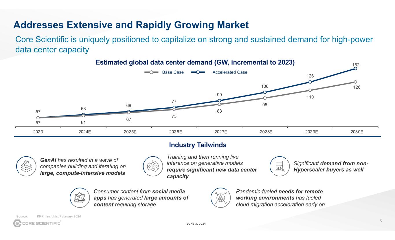 4 JUNE 3, 2024 Strengthens strategic relationship with CoreWeave, the AI Hyperscaler that just raised $7.5Bn in financing to continue its HPC expansion¹ Leverages close proximity to major metropolitan areas for minimal latency Construction expected to commence by early 2H 2024 and be energized in 1H 2025 Redeploying bitcoin mining capacity from designated HPC sites to dedicated bitcoin mining sites to support business continuity and growth Financial:Operational: Transaction summary Efficiently delivers 100% of costs to build out multiple sites to be cutting-edge, application- specific data centers customized for dense HPC² All capital expenditures are funded by CoreWeave² Estimated average annual revenue of $290 million³ HPC expansion expected to enhance Adj. EBITDA margins Initial term of 12 years with two, 5-year renewal options 1. Announced by CoreWeave on May 17, 2024 2. Up to $1.5 million per HPC MW (or approximately $300 million) of data center build out costs are funded by CoreWeave, and credited against hosting payments at no more than 50% of monthly fees until fully repaid. The balance of modification costs relate to items purchased directly by CoreWeave and contributed for use in the facility 3. Represents the estimated average annual revenue over the 12-year contract periods