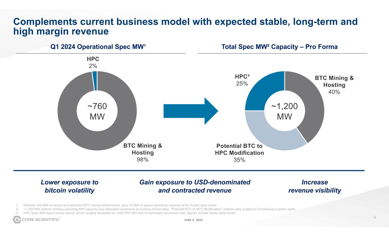5 JUNE 3, 2024 Addresses Extensive and Rapidly Growing Market Source: KKR | Insights, February 2024 Pandemic-fueled needs for remote working environments has fueled cloud migration acceleration early on Training and then running live inference on generative models require significant new data center capacity GenAI has resulted in a wave of companies building and iterating on large, compute-intensive models Significant demand from non- Hyperscaler buyers as well Consumer content from social media apps has generated large amounts of content requiring storage Industry Tailwinds Core Scientific is uniquely positioned to capitalize on strong and sustained demand for high-power data center capacity Estimated global data center demand (GW, incremental to 2023) Base Case Accelerated Case 57 63 69 77 90 106 126 152 57 61 67 73 83 95 110 126 40 60 80 100 120 140 160 2023 2024 2025 2026 2027 2028 2029 2030E E E E E E E
