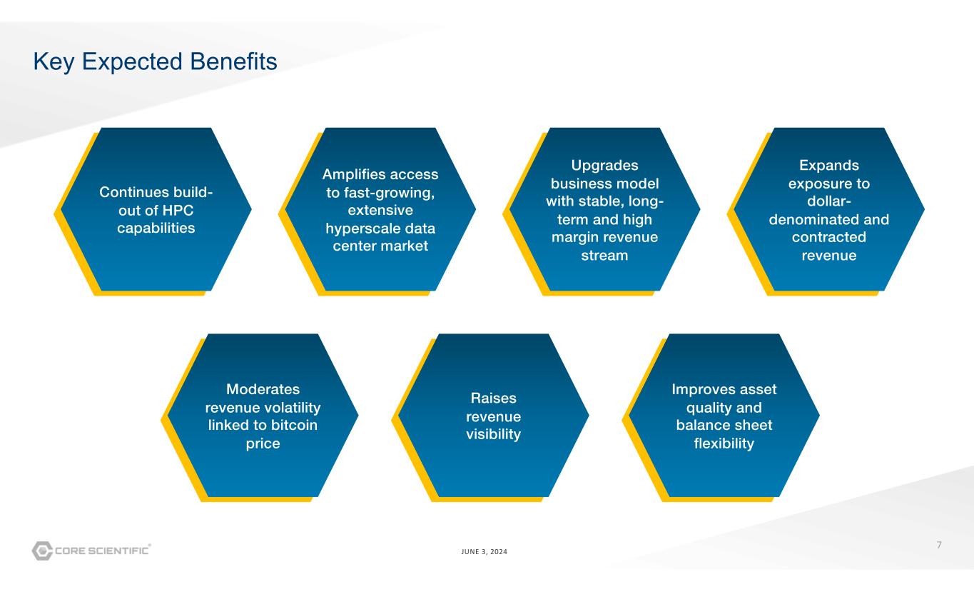 6 JUNE 3, 2024 Complements current business model with expected stable, long-term and high margin revenue 1. Reflects 745 MW of owned and operated BTC mining infrastructure, plus 16 MW of leased operating capacity at the Austin data center 2. ~1,200 MW reflects existing operating MW capacity plus estimated expansion at existing owned sites, “Potential BTC to HPC Modification” reflects sites subject to CoreWeave’s option rights 3. HPC Spec MW figure shown above, which roughly translates to ~200 HPC MW due to estimated conversion rate; figures include Austin data center Lower exposure to bitcoin volatility Gain exposure to USD-denominated and contracted revenue Increase revenue visibility Q1 2024 Operational Spec MW¹ Total Spec MW² Capacity – Pro Forma ~760 MW BTC Mining & Hosting 40% Potential BTC to HPC Modification 35% HPC³ 25% ~1,200 MW BTC Mining & Hosting 98% HPC 2%