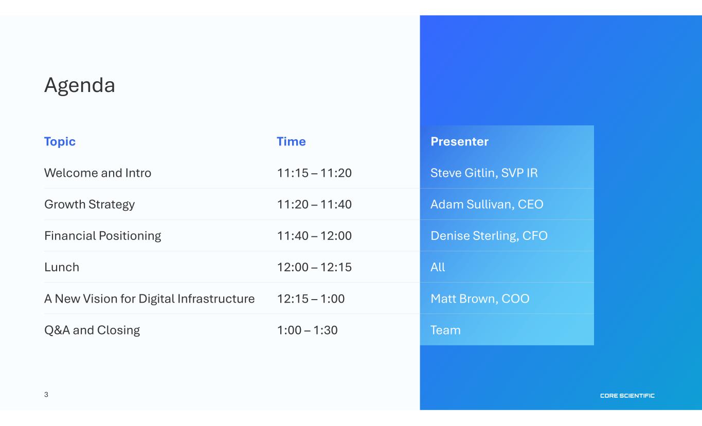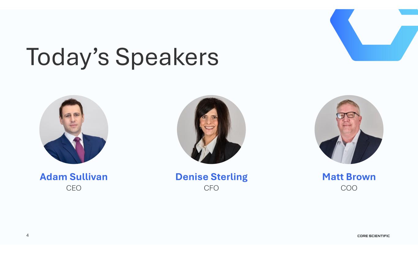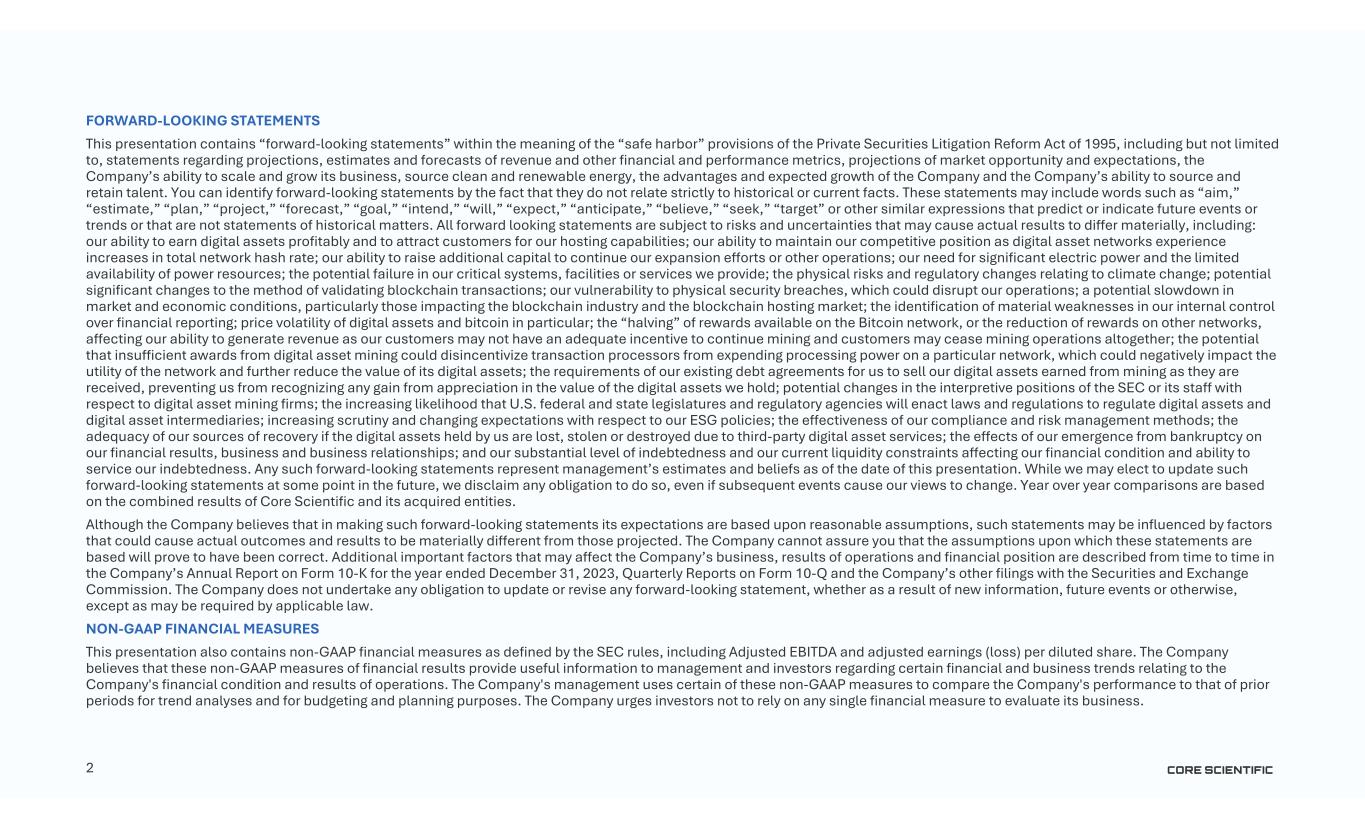 2 FORWARD-LOOKING STATEMENTS This presentation contains “forward-looking statements” within the meaning of the “safe harbor” provisions of the Private Securities Litigation Reform Act of 1995, including but not limited to, statements regarding projections, estimates and forecasts of revenue and other financial and performance metrics, projections of market opportunity and expectations, the Company’s ability to scale and grow its business, source clean and renewable energy, the advantages and expected growth of the Company and the Company’s ability to source and retain talent. You can identify forward-looking statements by the fact that they do not relate strictly to historical or current facts. These statements may include words such as “aim,” “estimate,” “plan,” “project,” “forecast,” “goal,” “intend,” “will,” “expect,” “anticipate,” “believe,” “seek,” “target” or other similar expressions that predict or indicate future events or trends or that are not statements of historical matters. All forward looking statements are subject to risks and uncertainties that may cause actual results to differ materially, including: our ability to earn digital assets profitably and to attract customers for our hosting capabilities; our ability to maintain our competitive position as digital asset networks experience increases in total network hash rate; our ability to raise additional capital to continue our expansion efforts or other operations; our need for significant electric power and the limited availability of power resources; the potential failure in our critical systems, facilities or services we provide; the physical risks and regulatory changes relating to climate change; potential significant changes to the method of validating blockchain transactions; our vulnerability to physical security breaches, which could disrupt our operations; a potential slowdown in market and economic conditions, particularly those impacting the blockchain industry and the blockchain hosting market; the identification of material weaknesses in our internal control over financial reporting; price volatility of digital assets and bitcoin in particular; the “halving” of rewards available on the Bitcoin network, or the reduction of rewards on other networks, affecting our ability to generate revenue as our customers may not have an adequate incentive to continue mining and customers may cease mining operations altogether; the potential that insufficient awards from digital asset mining could disincentivize transaction processors from expending processing power on a particular network, which could negatively impact the utility of the network and further reduce the value of its digital assets; the requirements of our existing debt agreements for us to sell our digital assets earned from mining as they are received, preventing us from recognizing any gain from appreciation in the value of the digital assets we hold; potential changes in the interpretive positions of the SEC or its staff with respect to digital asset mining firms; the increasing likelihood that U.S. federal and state legislatures and regulatory agencies will enact laws and regulations to regulate digital assets and digital asset intermediaries; increasing scrutiny and changing expectations with respect to our ESG policies; the effectiveness of our compliance and risk management methods; the adequacy of our sources of recovery if the digital assets held by us are lost, stolen or destroyed due to third-party digital asset services; the effects of our emergence from bankruptcy on our financial results, business and business relationships; and our substantial level of indebtedness and our current liquidity constraints affecting our financial condition and ability to service our indebtedness. Any such forward-looking statements represent management’s estimates and beliefs as of the date of this presentation. While we may elect to update such forward-looking statements at some point in the future, we disclaim any obligation to do so, even if subsequent events cause our views to change. Year over year comparisons are based on the combined results of Core Scientific and its acquired entities. Although the Company believes that in making such forward-looking statements its expectations are based upon reasonable assumptions, such statements may be influenced by factors that could cause actual outcomes and results to be materially different from those projected. The Company cannot assure you that the assumptions upon which these statements are based will prove to have been correct. Additional important factors that may affect the Company’s business, results of operations and financial position are described from time to time in the Company’s Annual Report on Form 10-K for the year ended December 31, 2023, Quarterly Reports on Form 10-Q and the Company’s other filings with the Securities and Exchange Commission. The Company does not undertake any obligation to update or revise any forward-looking statement, whether as a result of new information, future events or otherwise, except as may be required by applicable law. NON-GAAP FINANCIAL MEASURES This presentation also contains non-GAAP financial measures as defined by the SEC rules, including Adjusted EBITDA and adjusted earnings (loss) per diluted share. The Company believes that these non-GAAP measures of financial results provide useful information to management and investors regarding certain financial and business trends relating to the Company's financial condition and results of operations. The Company's management uses certain of these non-GAAP measures to compare the Company's performance to that of prior periods for trend analyses and for budgeting and planning purposes. The Company urges investors not to rely on any single financial measure to evaluate its business.