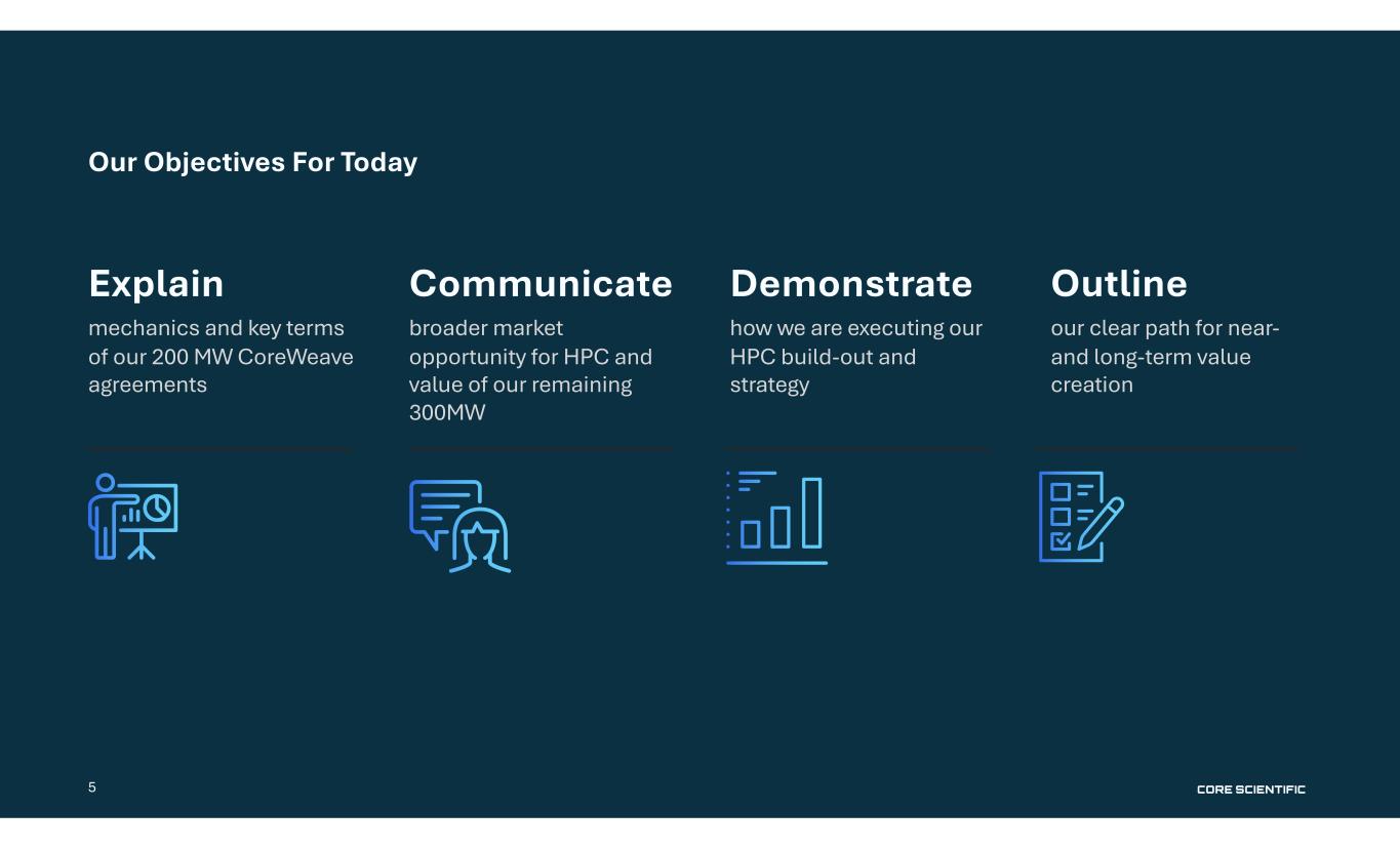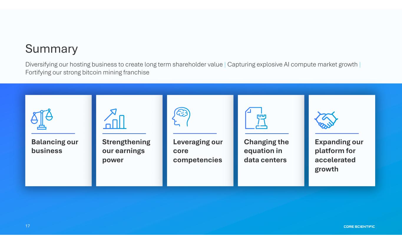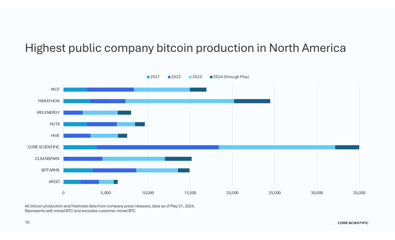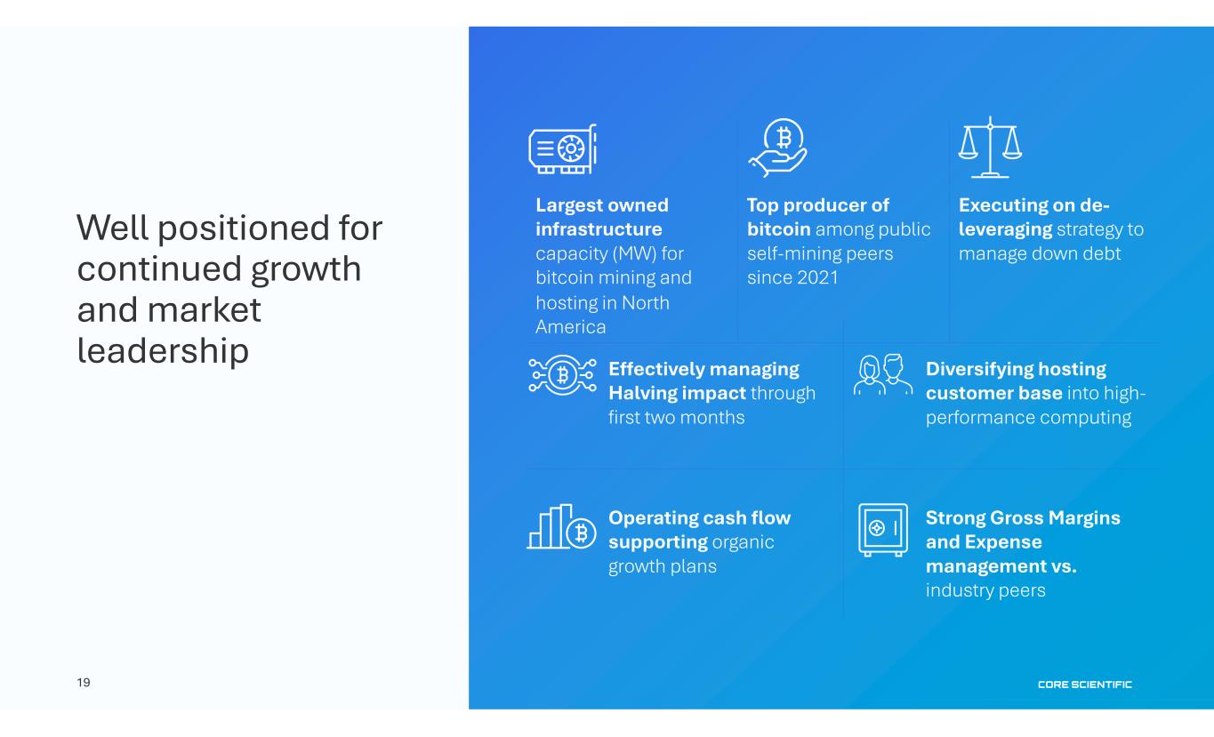 2 FORWARD-LOOKING STATEMENTS This presentation contains “forward-looking statements” within the meaning of the “safe harbor” provisions of the Private Securities Litigation Reform Act of 1995, including but not limited to, statements regarding projections, estimates and forecasts of revenue and other financial and performance metrics, projections of market opportunity and expectations, the Company’s ability to scale and grow its business, source clean and renewable energy, the advantages and expected growth of the Company and the Company’s ability to source and retain talent. You can identify forward-looking statements by the fact that they do not relate strictly to historical or current facts. These statements may include words such as “aim,” “estimate,” “plan,” “project,” “forecast,” “goal,” “intend,” “will,” “expect,” “anticipate,” “believe,” “seek,” “target” or other similar expressions that predict or indicate future events or trends or that are not statements of historical matters. All forward looking statements are subject to risks and uncertainties that may cause actual results to differ materially, including: our ability to earn digital assets profitably and to attract customers for our hosting capabilities; our ability to maintain our competitive position as digital asset networks experience increases in total network hash rate; our ability to raise additional capital to continue our expansion efforts or other operations; our need for significant electric power and the limited availability of power resources; the potential failure in our critical systems, facilities or services we provide; the physical risks and regulatory changes relating to climate change; potential significant changes to the method of validating blockchain transactions; our vulnerability to physical security breaches, which could disrupt our operations; a potential slowdown in market and economic conditions, particularly those impacting the blockchain industry and the blockchain hosting market; the identification of material weaknesses in our internal control over financial reporting; price volatility of digital assets and bitcoin in particular; the “halving” of rewards available on the Bitcoin network, or the reduction of rewards on other networks, affecting our ability to generate revenue as our customers may not have an adequate incentive to continue mining and customers may cease mining operations altogether; the potential that insufficient awards from digital asset mining could disincentivize transaction processors from expending processing power on a particular network, which could negatively impact the utility of the network and further reduce the value of its digital assets; the requirements of our existing debt agreements for us to sell our digital assets earned from mining as they are received, preventing us from recognizing any gain from appreciation in the value of the digital assets we hold; potential changes in the interpretive positions of the SEC or its staff with respect to digital asset mining firms; the increasing likelihood that U.S. federal and state legislatures and regulatory agencies will enact laws and regulations to regulate digital assets and digital asset intermediaries; increasing scrutiny and changing expectations with respect to our ESG policies; the effectiveness of our compliance and risk management methods; the adequacy of our sources of recovery if the digital assets held by us are lost, stolen or destroyed due to third-party digital asset services; the effects of our emergence from bankruptcy on our financial results, business and business relationships; and our substantial level of indebtedness and our current liquidity constraints affecting our financial condition and ability to service our indebtedness. Any such forward-looking statements represent management’s estimates and beliefs as of the date of this presentation. While we may elect to update such forward-looking statements at some point in the future, we disclaim any obligation to do so, even if subsequent events cause our views to change. Year over year comparisons are based on the combined results of Core Scientific and its acquired entities. Although the Company believes that in making such forward-looking statements its expectations are based upon reasonable assumptions, such statements may be influenced by factors that could cause actual outcomes and results to be materially different from those projected. The Company cannot assure you that the assumptions upon which these statements are based will prove to have been correct. Additional important factors that may affect the Company’s business, results of operations and financial position are described from time to time in the Company’s Annual Report on Form 10-K for the year ended December 31, 2023, Quarterly Reports on Form 10-Q and the Company’s other filings with the Securities and Exchange Commission. The Company does not undertake any obligation to update or revise any forward-looking statement, whether as a result of new information, future events or otherwise, except as may be required by applicable law. NON-GAAP FINANCIAL MEASURES This presentation also contains non-GAAP financial measures as defined by the SEC rules, including Adjusted EBITDA and adjusted earnings (loss) per diluted share. The Company believes that these non-GAAP measures of financial results provide useful information to management and investors regarding certain financial and business trends relating to the Company's financial condition and results of operations. The Company's management uses certain of these non-GAAP measures to compare the Company's performance to that of prior periods for trend analyses and for budgeting and planning purposes. The Company urges investors not to rely on any single financial measure to evaluate its business.