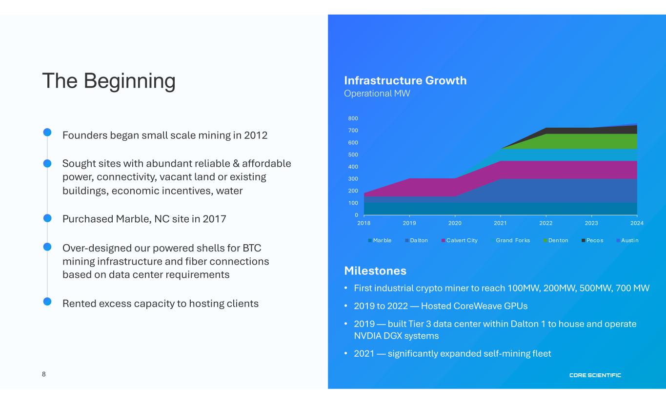 7 Core Scientific energizes high-value compute through two businesses Eight high-power data centers in five U.S. states employing proprietary tech stack firmware, fleet management and energy management Bitcoin Mining • Operate owned fleet of ~173,000 bitcoin miners producing 20.4 EH/s of hash rate1 • Average miner energy efficiency 24.23 J/TH1 • 2024 goal of 21.8 EH/s • Currently sell bitcoin rewards for USD Hosting • Bitcoin miners: • Operate ~51,000 client-owned bitcoin miners producing 5.7 EH/s hash rate1 • High-performance computing (HPC): • Now hosting CoreWeave’s NVIDIA servers at 16MW data center in Austin, Texas • Plan to host thousands more GPUs to support HPC and AI compute 1. As of 5/31/24