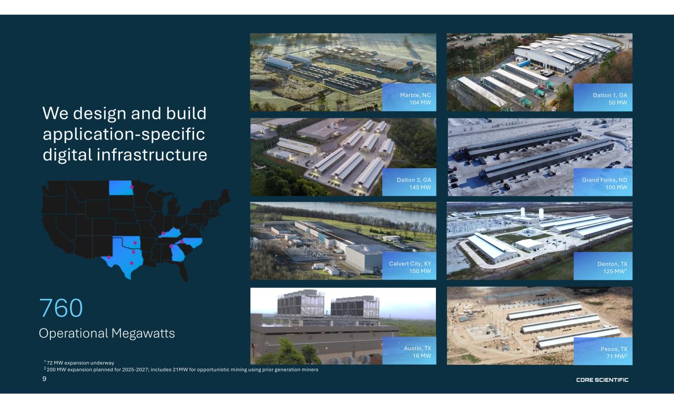 CORE SCIENTIFIC8 The Beginning Founders began small scale mining in 2012 Sought sites with abundant reliable & affordable power, connectivity, vacant land or existing buildings, economic incentives, water Purchased Marble, NC site in 2017 Over-designed our powered shells for BTC mining infrastructure and fiber connections based on data center requirements Rented excess capacity to hosting clients 0 100 200 300 400 500 600 700 800 2018 2019 2020 2021 2022 2023 2024 Mar ble Da lton Calvert City Grand For ks Den ton Peco s Austin Infrastructure Growth Operational MW Milestones • First industrial crypto miner to reach 100MW, 200MW, 500MW, 700 MW • 2019 to 2022 — Hosted CoreWeave GPUs • 2019 — built Tier 3 data center within Dalton 1 to house and operate NVDIA DGX systems • 2021 — significantly expanded self-mining fleet