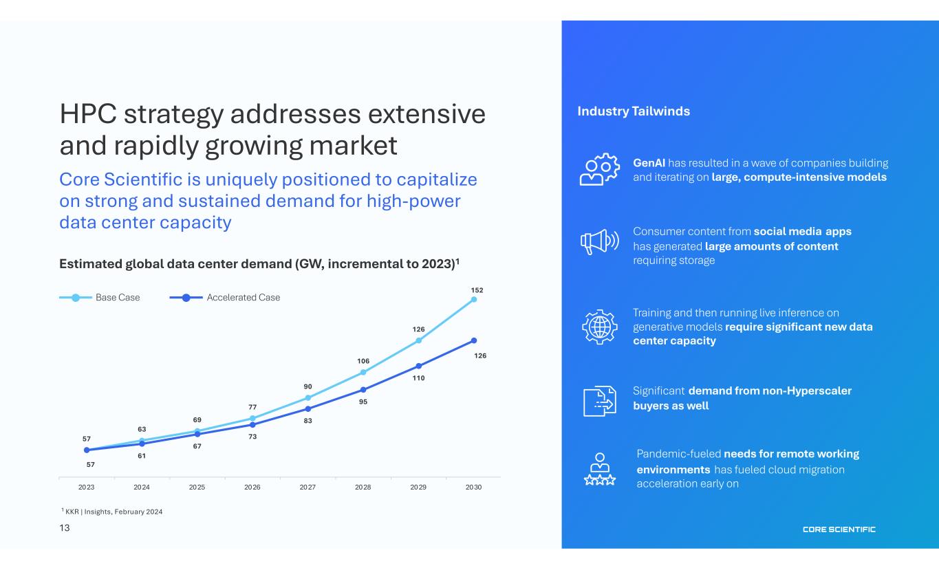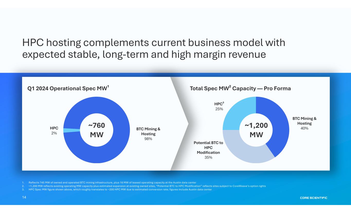 13 HPC strategy addresses extensive and rapidly growing market Core Scientific is uniquely positioned to capitalize on strong and sustained demand for high-power data center capacity 57 63 69 77 90 106 126 152 57 61 67 73 83 95 110 126 2023 2024 2025 2026 2027 2028 2029 2030 Estimated global data center demand (GW, incremental to 2023)1 Base Case Accelerated Case Industry Tailwinds Pandemic-fueled needs for remote working environments has fueled cloud migration acceleration early on Training and then running live inference on generative models require significant new data center capacity GenAI has resulted in a wave of companies building and iterating on large, compute-intensive models Significant demand from non-Hyperscaler buyers as well Consumer content from social media apps has generated large amounts of content requiring storage 1 KKR | Insights, February 2024