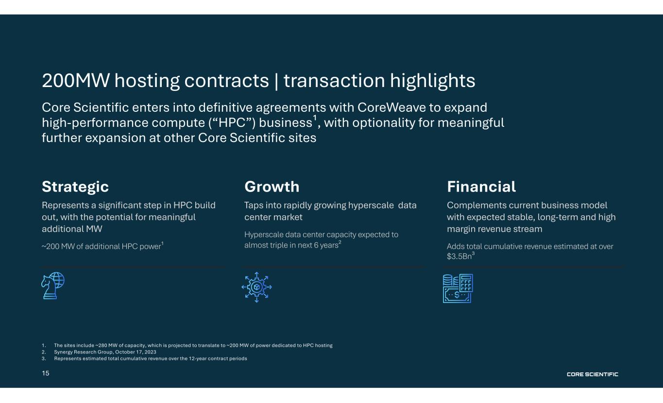14 HPC hosting complements current business model with expected stable, long-term and high margin revenue 1. Reflects 745 MW of owned and operated BTC mining infrastructure, plus 16 MW of leased operating capacity at the Austin data center 2. ~1,200 MW reflects existing operating MW capacity plus estimated expansion at existing owned sites, “Potential BTC to HPC Modification” reflects sites subject to CoreWeave’s option rights 3. HPC Spec MW figure shown above, which roughly translates to ~200 HPC MW due to estimated conversion rate; figures include Austin data center Total Spec MW² Capacity — Pro FormaQ1 2024 Operational Spec MW¹ BTC Mining & Hosting 40% Potential BTC to HPC Modification 35% HPC³ 25% ~1,200 MW BTC Mining & Hosting 98% HPC 2% ~760 MW