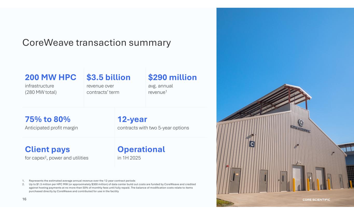 15 200MW hosting contracts | transaction highlights Core Scientific enters into definitive agreements with CoreWeave to expand high-performance compute (“HPC”) business¹, with optionality for meaningful further expansion at other Core Scientific sites 1. The sites include ~280 MW of capacity, which is projected to translate to ~200 MW of power dedicated to HPC hosting 2. Synergy Research Group, October 17, 2023 3. Represents estimated total cumulative revenue over the 12-year contract periods Strategic Represents a significant step in HPC build out, with the potential for meaningful additional MW ~200 MW of additional HPC power¹ Growth Taps into rapidly growing hyperscale data center market Hyperscale data center capacity expected to almost triple in next 6 years² Financial Complements current business model with expected stable, long-term and high margin revenue stream Adds total cumulative revenue estimated at over $3.5Bn³