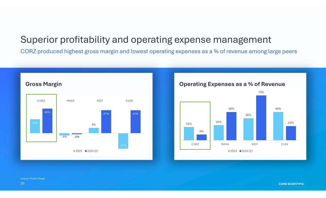 19 Well positioned for continued growth and market leadership Largest owned infrastructure capacity (MW) for bitcoin mining and hosting in North America Top producer of bitcoin among public self-mining peers since 2021 Executing on de- leveraging strategy to manage down debt Effectively managing Halving impact through first two months Diversifying hosting customer base into high- performance computing Operating cash flow supporting organic growth plans Strong Gross Margins and Expense management vs. industry peers