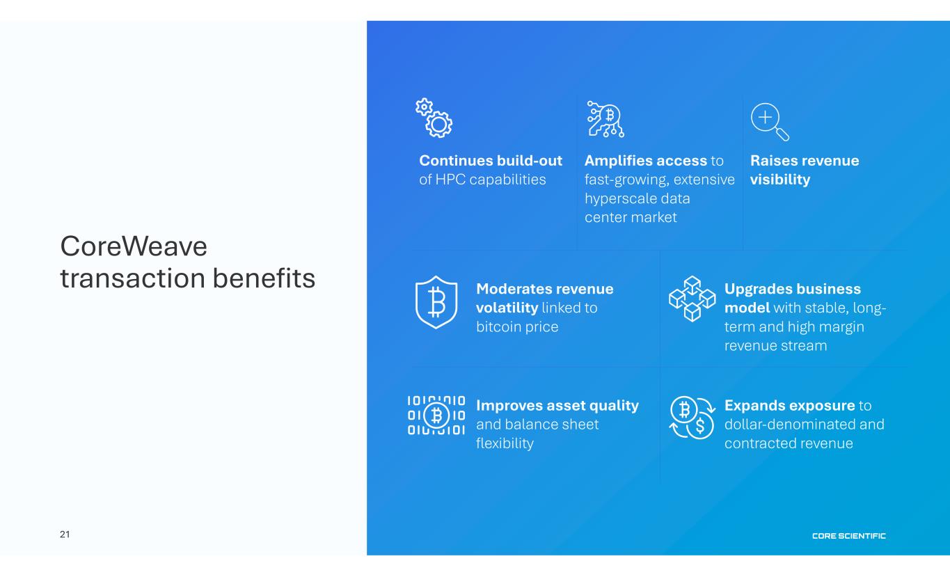 20 Superior profitability and operating expense management CORZ produced highest gross margin and lowest operating expenses as a % of revenue among large peers Source: Public filings Gross Margin Operating Expenses as a % of Revenue 25% -4% 9% -27% 43% -2% 41% 41% CORZ MARA RIOT CLSK 2023 2024 Q1 22% 25% 36% 46% 9% 46% 73% 23% CORZ MARA RIOT CLSK 2023 2024 Q1