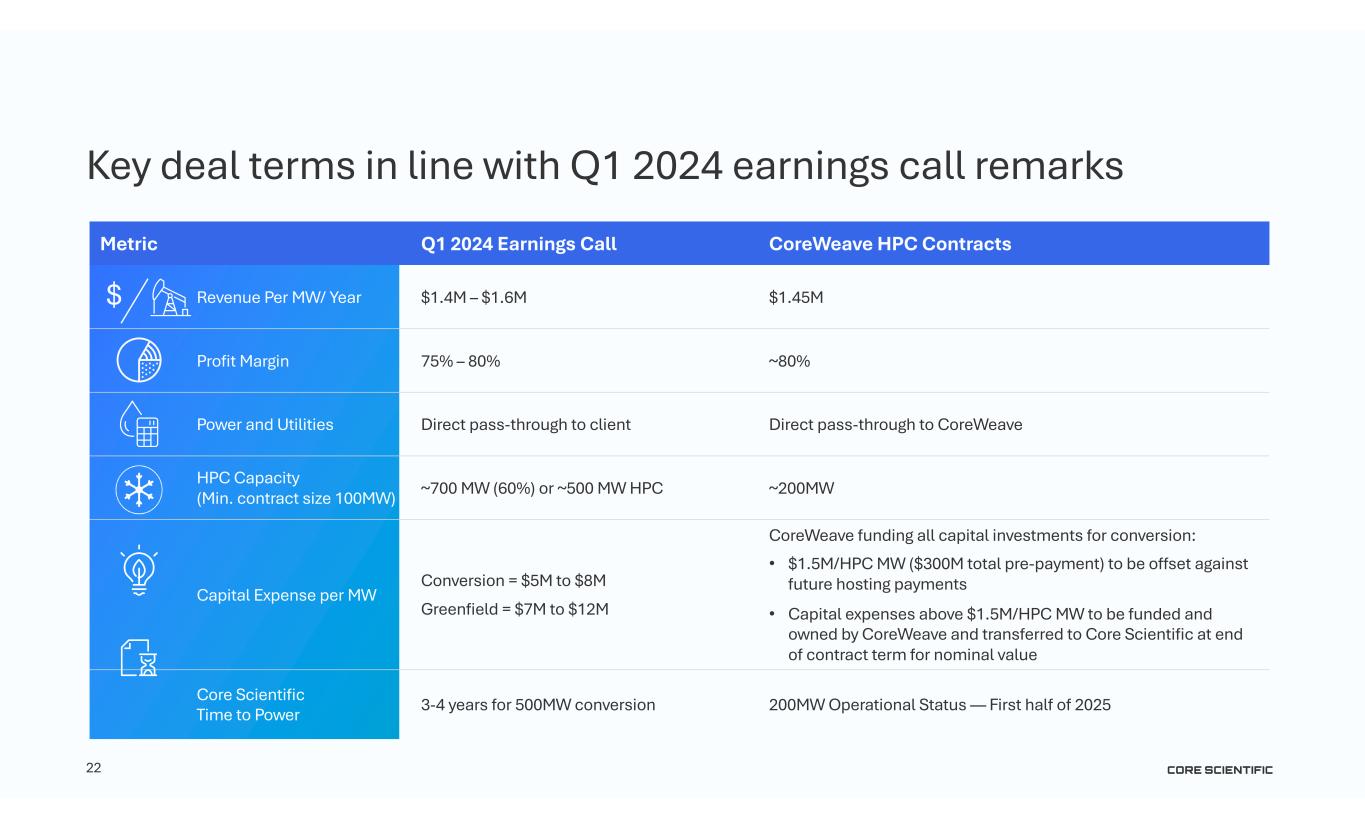 22 Metric Q1 2024 Earnings Call CoreWeave HPC Contracts Revenue Per MW/ Year $1.4M – $1.6M $1.45M Profit Margin 75% – 80% ~80% Power and Utilities Direct pass-through to client Direct pass-through to CoreWeave HPC Capacity (Min. contract size 100MW) ~700 MW (60%) or ~500 MW HPC ~200MW Capital Expense per MW Conversion = $5M to $8M Greenfield = $7M to $12M CoreWeave funding all capital investments for conversion: • $1.5M/HPC MW ($300M total pre-payment) to be offset against future hosting payments • Capital expenses above $1.5M/HPC MW to be funded and owned by CoreWeave and transferred to Core Scientific at end of contract term for nominal value Core Scientific Time to Power 3-4 years for 500MW conversion 200MW Operational Status — First half of 2025 $ Key deal terms in line with Q1 2024 earnings call remarks