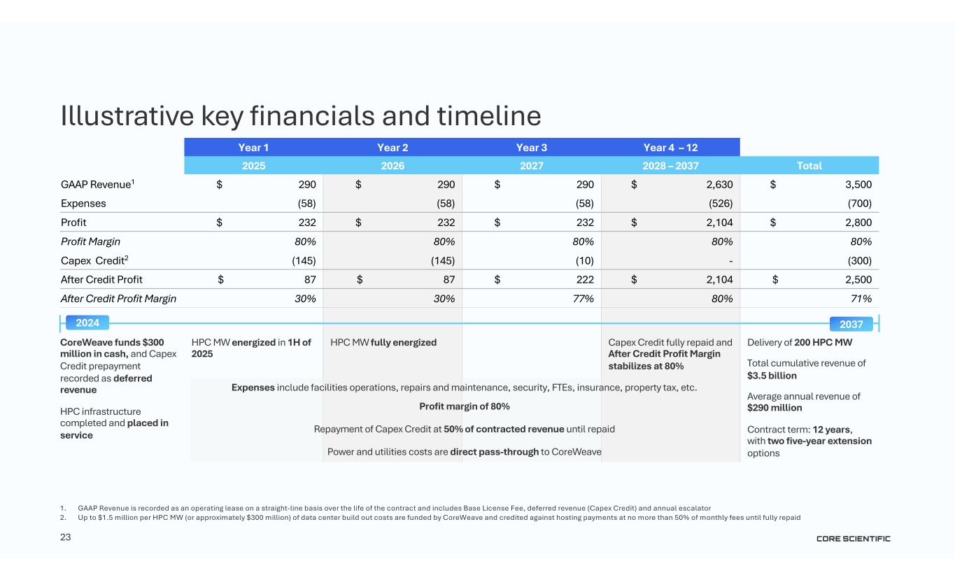 23 1. GAAP Revenue is recorded as an operating lease on a straight-line basis over the life of the contract and includes Base License Fee, deferred revenue (Capex Credit) and annual escalator 2. Up to $1.5 million per HPC MW (or approximately $300 million) of data center build out costs are funded by CoreWeave and credited against hosting payments at no more than 50% of monthly fees until fully repaid Year 1 Year 2 Year 3 Year 4 – 12 2025 2026 2027 2028 – 2037 Total GAAP Revenue1 $ 290 $ 290 $ 290 $ 2,630 $ 3,500 Expenses (58) (58) (58) (526) (700) Profit $ 232 $ 232 $ 232 $ 2,104 $ 2,800 Profit Margin 80% 80% 80% 80% 80% Capex Credit2 (145) (145) (10) - (300) After Credit Profit $ 87 $ 87 $ 222 $ 2,104 $ 2,500 After Credit Profit Margin 30% 30% 77% 80% 71% CoreWeave funds $300 million in cash, and Capex Credit prepayment recorded as deferred revenue HPC infrastructure completed and placed in service HPC MW energized in 1H of 2025 HPC MW fully energized Capex Credit fully repaid and After Credit Profit Margin stabilizes at 80% Delivery of 200 HPC MW Total cumulative revenue of $3.5 billion Average annual revenue of $290 million Contract term: 12 years, with two five-year extension options Illustrative key financials and timeline 2024 2037 Expenses include facilities operations, repairs and maintenance, security, FTEs, insurance, property tax, etc. Profit margin of 80% Repayment of Capex Credit at 50% of contracted revenue until repaid Power and utilities costs are direct pass-through to CoreWeave