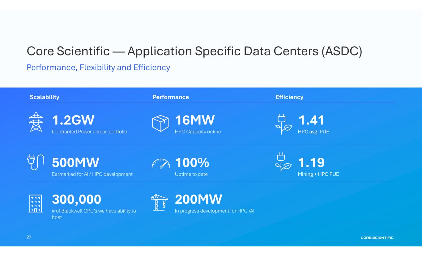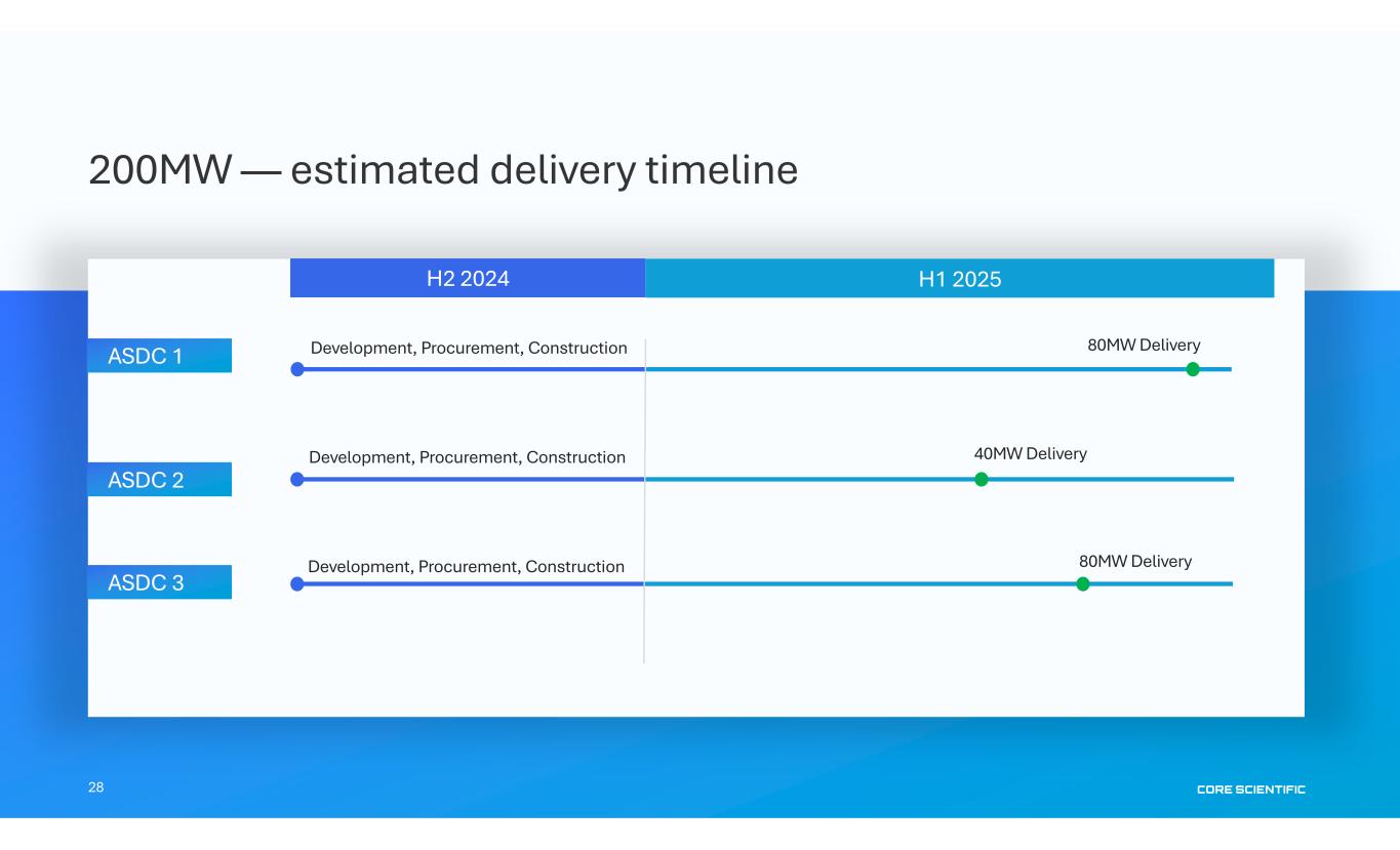 27 Core Scientific — Application Specific Data Centers (ASDC) Performance, Flexibility and Efficiency Scalability Performance Efficiency 1.2GW Contracted Power across portfolio 16MW HPC Capacity online 1.41 HPC avg. PUE 500MW Earmarked for AI / HPC development 100% Uptime to date 1.19 Mining + HPC PUE 300,000 # of Blackwell GPU’s we have ability to host 200MW In progress development for HPC /AI