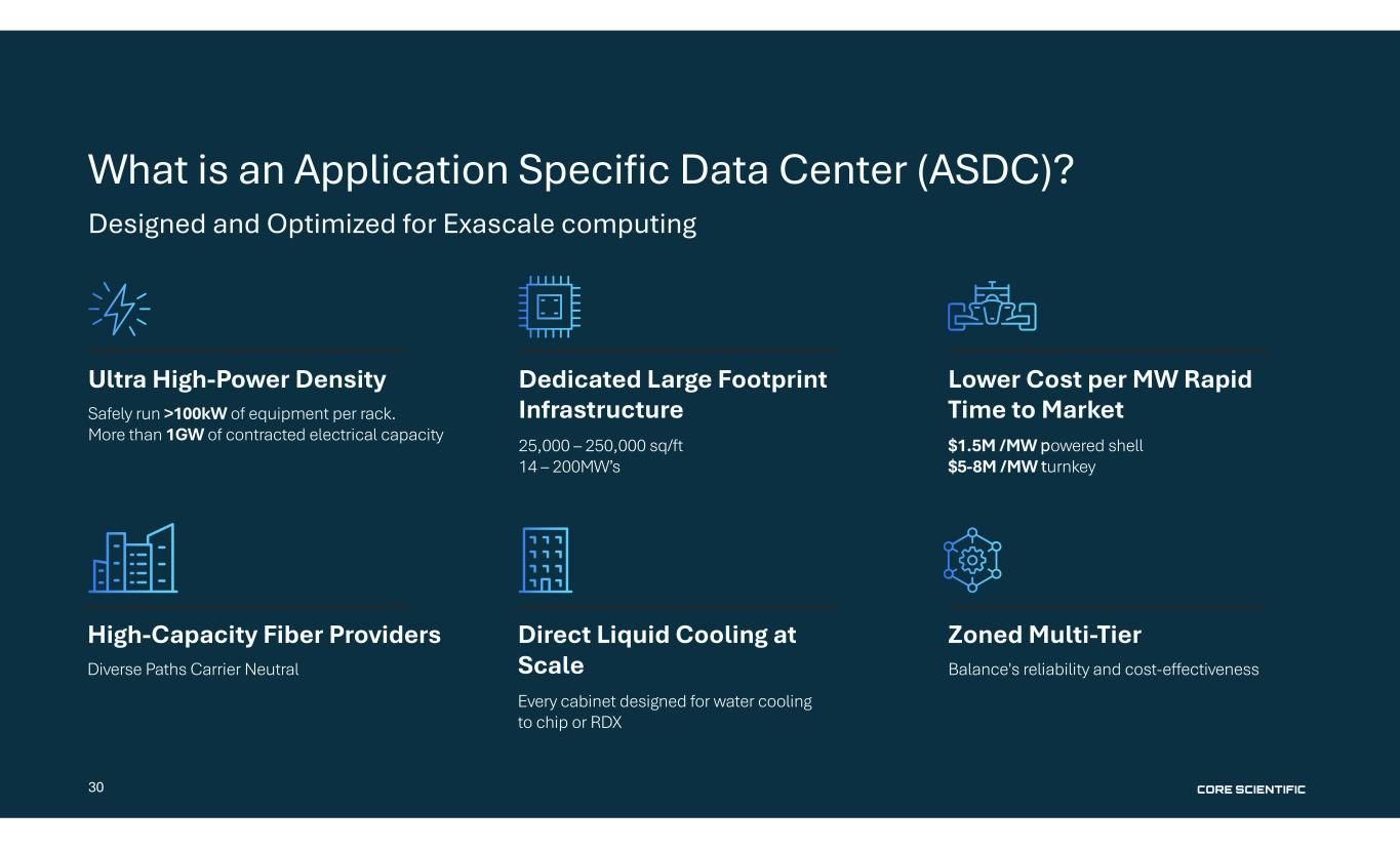 30 What is an Application Specific Data Center (ASDC)? Designed and Optimized for Exascale computing Ultra High-Power Density Safely run >100kW of equipment per rack. More than 1GW of contracted electrical capacity Dedicated Large Footprint Infrastructure 25,000 – 250,000 sq/ft 14 – 200MW’s Lower Cost per MW Rapid Time to Market $1.5M /MW powered shell $5-8M /MW turnkey High-Capacity Fiber Providers Diverse Paths Carrier Neutral Direct Liquid Cooling at Scale Every cabinet designed for water cooling to chip or RDX Zoned Multi-Tier Balance's reliability and cost-effectiveness