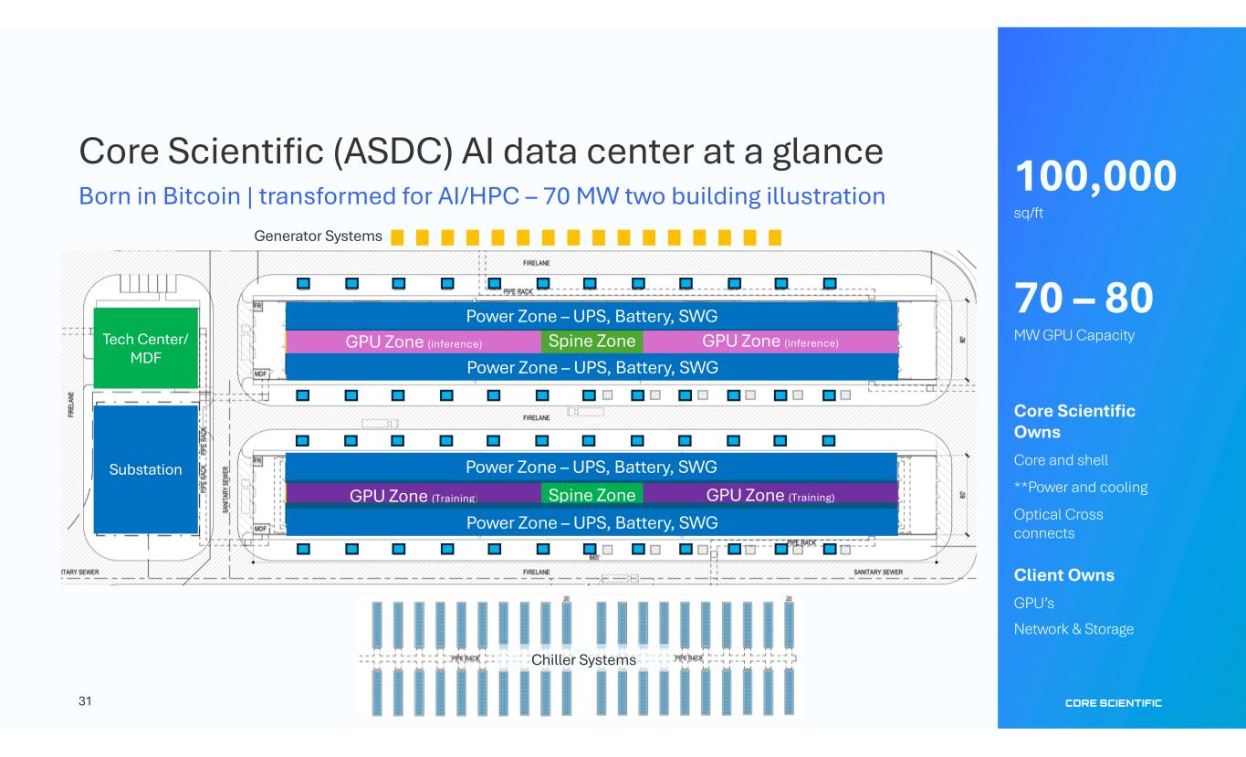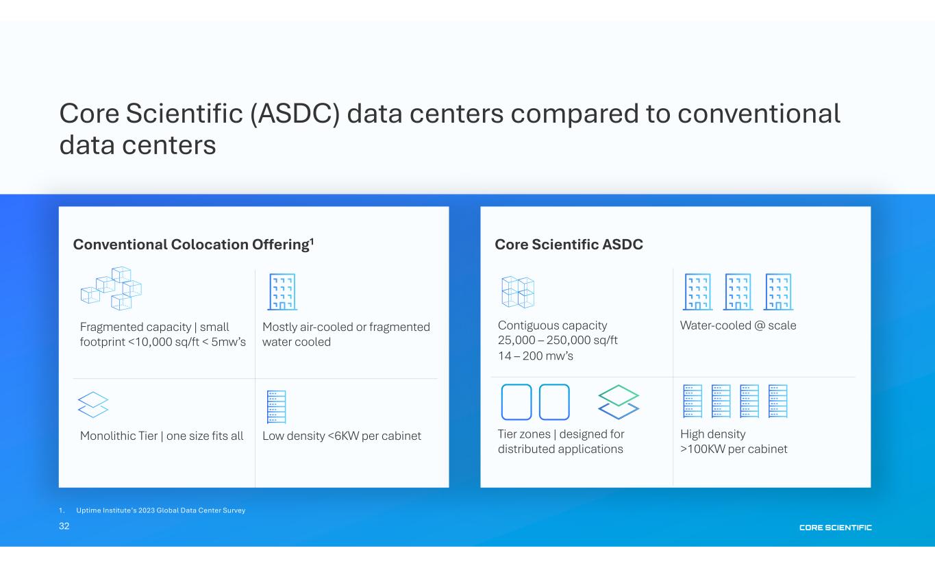 31 ASIC HOT AISLE ASIC HOT AISLE GPU Zone (inference)pine ZoneGPU Zone (inference) GPU Zone (Training)pine ZoneGPU Zone (Training) Tech Center/ MDF Substation Chiller Systems Core Scientific Owns Core and shell **Power and cooling Optical Cross connects Client Owns GPU’s Network & Storage Core Scientific (ASDC) AI data center at a glance Born in Bitcoin | transformed for AI/HPC – 70 MW two building illustration 100,000 sq/ft 70 – 80 MW GPU Capacity ASIC Miners ASIC Miners ASIC Miners ASIC Miners Power Zone – UPS, Battery, SWG Power Zone – UPS, Battery, SWG Power Zone – UPS, Battery, SWG Power Zone – UPS, Battery, SWG Generator Systems