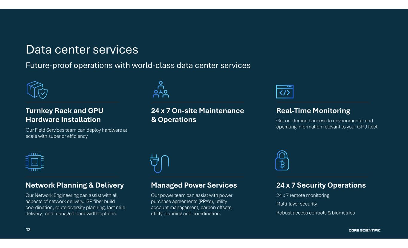 32 Core Scientific (ASDC) data centers compared to conventional data centers Conventional Colocation Offering1 Core Scientific ASDC Fragmented capacity | small footprint <10,000 sq/ft < 5mw’s Mostly air-cooled or fragmented water cooled Monolithic Tier | one size fits all Low density <6KW per cabinet Contiguous capacity 25,000 – 250,000 sq/ft 14 – 200 mw’s Water-cooled @ scale Tier zones | designed for distributed applications High density >100KW per cabinet 1. Uptime Institute’s 2023 Global Data Center Survey