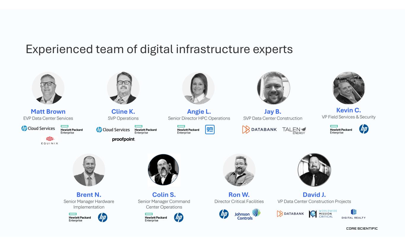 Experienced team of digital infrastructure experts Matt Brown EVP Data Center Services Cline K. SVP Operations Angie L. Senior Director HPC Operations Jay B. SVP Data Center Construction Kevin C. VP Field Services & Security Brent N. Senior Manager Hardware Implementation Colin S. Senior Manager Command Center Operations Ron W. Director Critical Facilities David J. VP Data Center Construction Projects