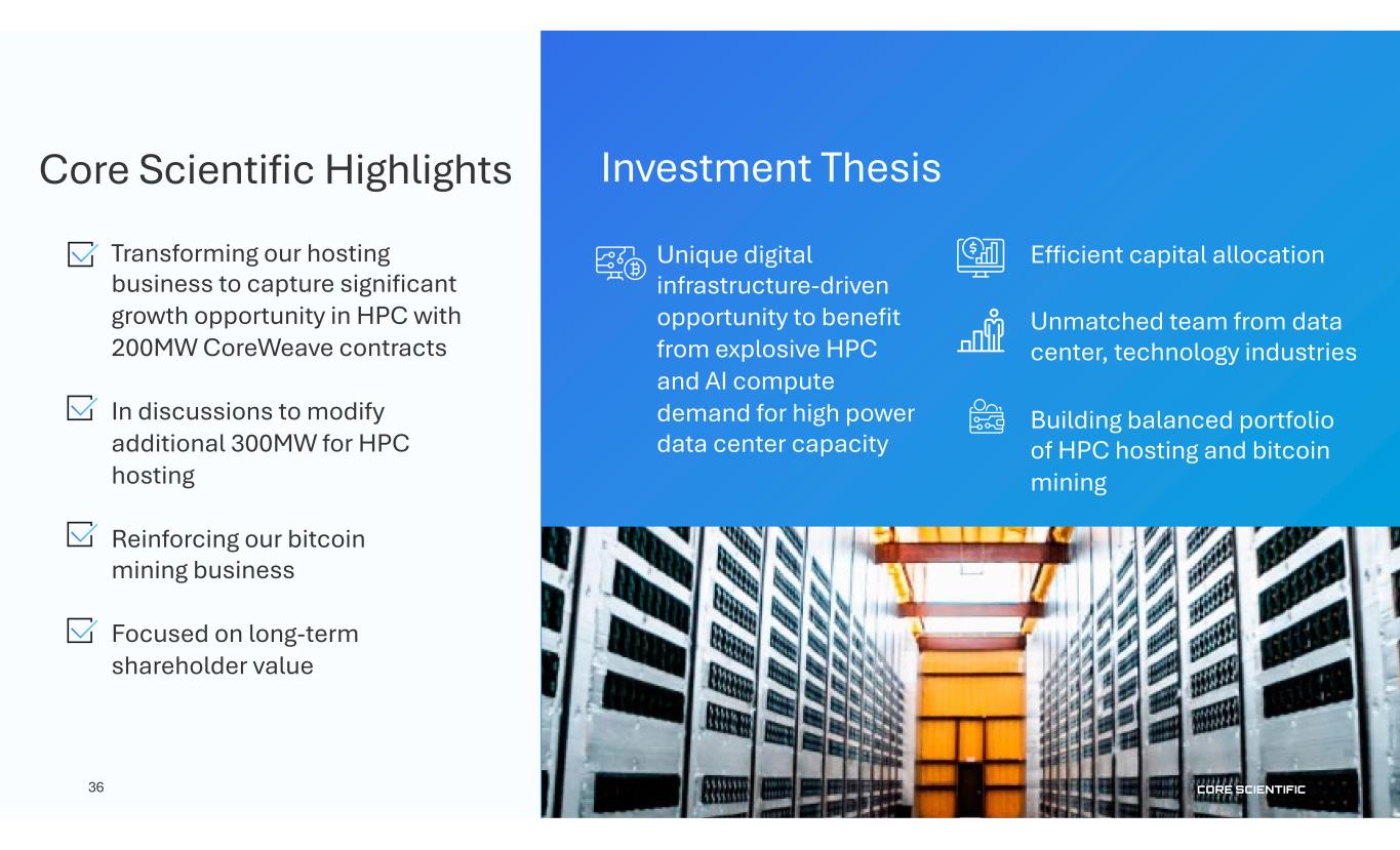 36 Core Scientific Highlights Transforming our hosting business to capture significant growth opportunity in HPC with 200MW CoreWeave contracts In discussions to modify additional 300MW for HPC hosting Reinforcing our bitcoin mining business Focused on long-term shareholder value Investment Thesis Unique digital infrastructure-driven opportunity to benefit from explosive HPC and AI compute demand for high power data center capacity Efficient capital allocation Unmatched team from data center, technology industries Building balanced portfolio of HPC hosting and bitcoin mining