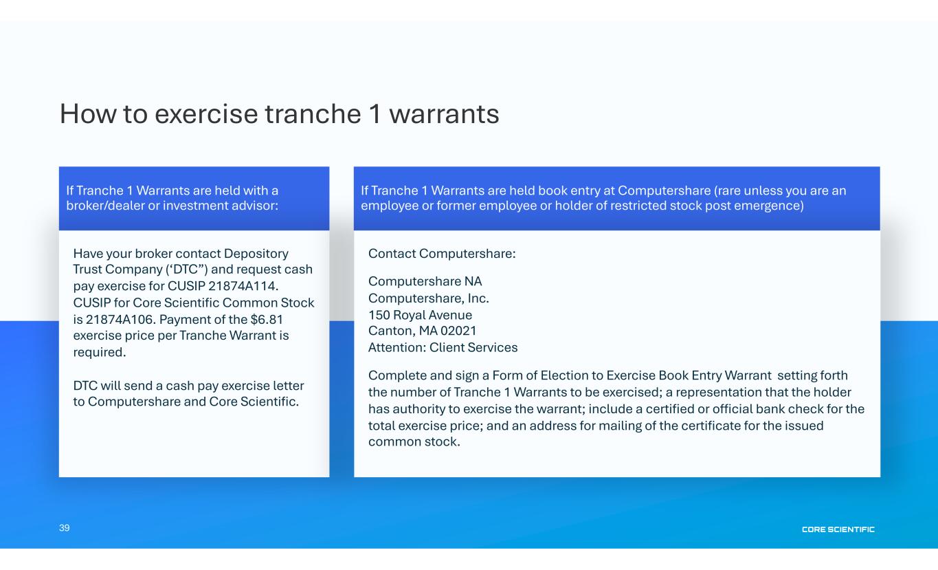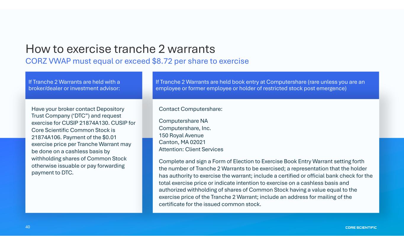 39 How to exercise tranche 1 warrants If Tranche 1 Warrants are held with a broker/dealer or investment advisor: If Tranche 1 Warrants are held book entry at Computershare (rare unless you are an employee or former employee or holder of restricted stock post emergence) Have your broker contact Depository Trust Company (‘DTC”) and request cash pay exercise for CUSIP 21874A114. CUSIP for Core Scientific Common Stock is 21874A106. Payment of the $6.81 exercise price per Tranche Warrant is required. DTC will send a cash pay exercise letter to Computershare and Core Scientific. Contact Computershare: Computershare NA Computershare, Inc. 150 Royal Avenue Canton, MA 02021 Attention: Client Services Complete and sign a Form of Election to Exercise Book Entry Warrant setting forth the number of Tranche 1 Warrants to be exercised; a representation that the holder has authority to exercise the warrant; include a certified or official bank check for the total exercise price; and an address for mailing of the certificate for the issued common stock.