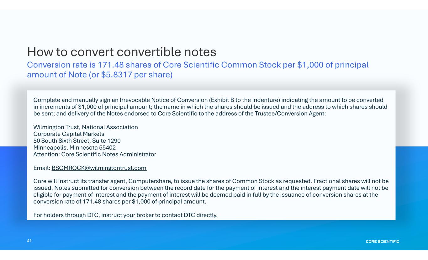 40 How to exercise tranche 2 warrants CORZ VWAP must equal or exceed $8.72 per share to exercise If Tranche 2 Warrants are held with a broker/dealer or investment advisor: If Tranche 2 Warrants are held book entry at Computershare (rare unless you are an employee or former employee or holder of restricted stock post emergence) Have your broker contact Depository Trust Company (‘DTC”) and request exercise for CUSIP 21874A130. CUSIP for Core Scientific Common Stock is 21874A106. Payment of the $0.01 exercise price per Tranche Warrant may be done on a cashless basis by withholding shares of Common Stock otherwise issuable or pay forwarding payment to DTC. Contact Computershare: Computershare NA Computershare, Inc. 150 Royal Avenue Canton, MA 02021 Attention: Client Services Complete and sign a Form of Election to Exercise Book Entry Warrant setting forth the number of Tranche 2 Warrants to be exercised; a representation that the holder has authority to exercise the warrant; include a certified or official bank check for the total exercise price or indicate intention to exercise on a cashless basis and authorized withholding of shares of Common Stock having a value equal to the exercise price of the Tranche 2 Warrant; include an address for mailing of the certificate for the issued common stock.