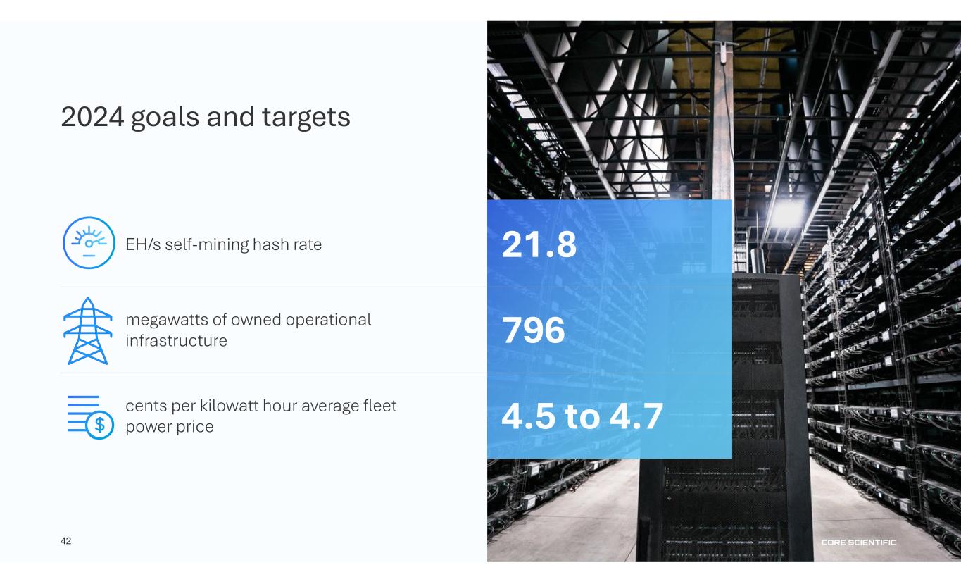 42 2024 goals and targets EH/s self-mining hash rate 21.8 megawatts of owned operational infrastructure 796 cents per kilowatt hour average fleet power price 4.5 to 4.7